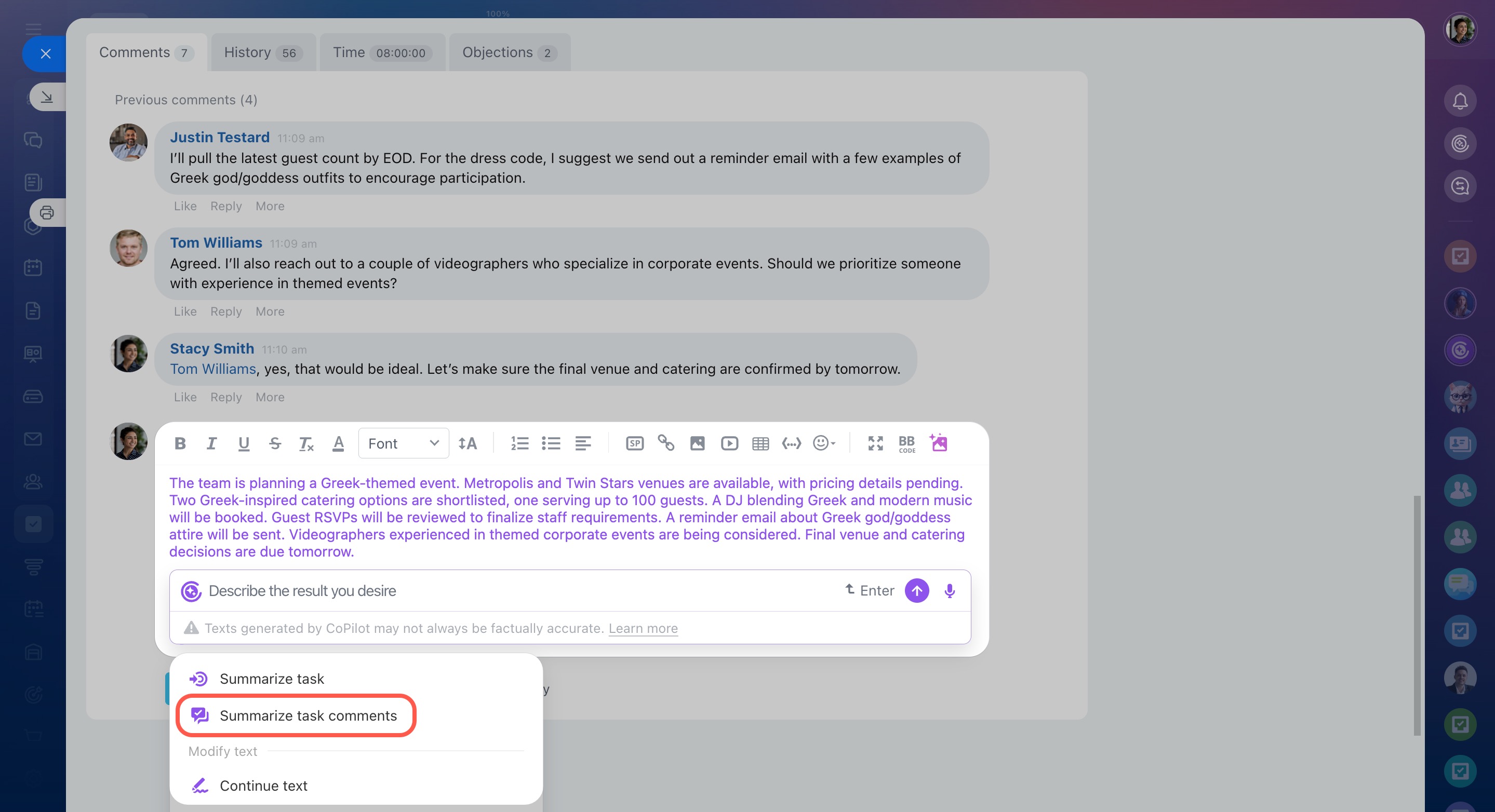 When you have a lot of tasks and dozens of comments in each, it's hard to keep the whole context in mind. To quickly review a discussion, utilize the Summarize task comments pre-prompt. CoPilot will instantly highlight the major points.
