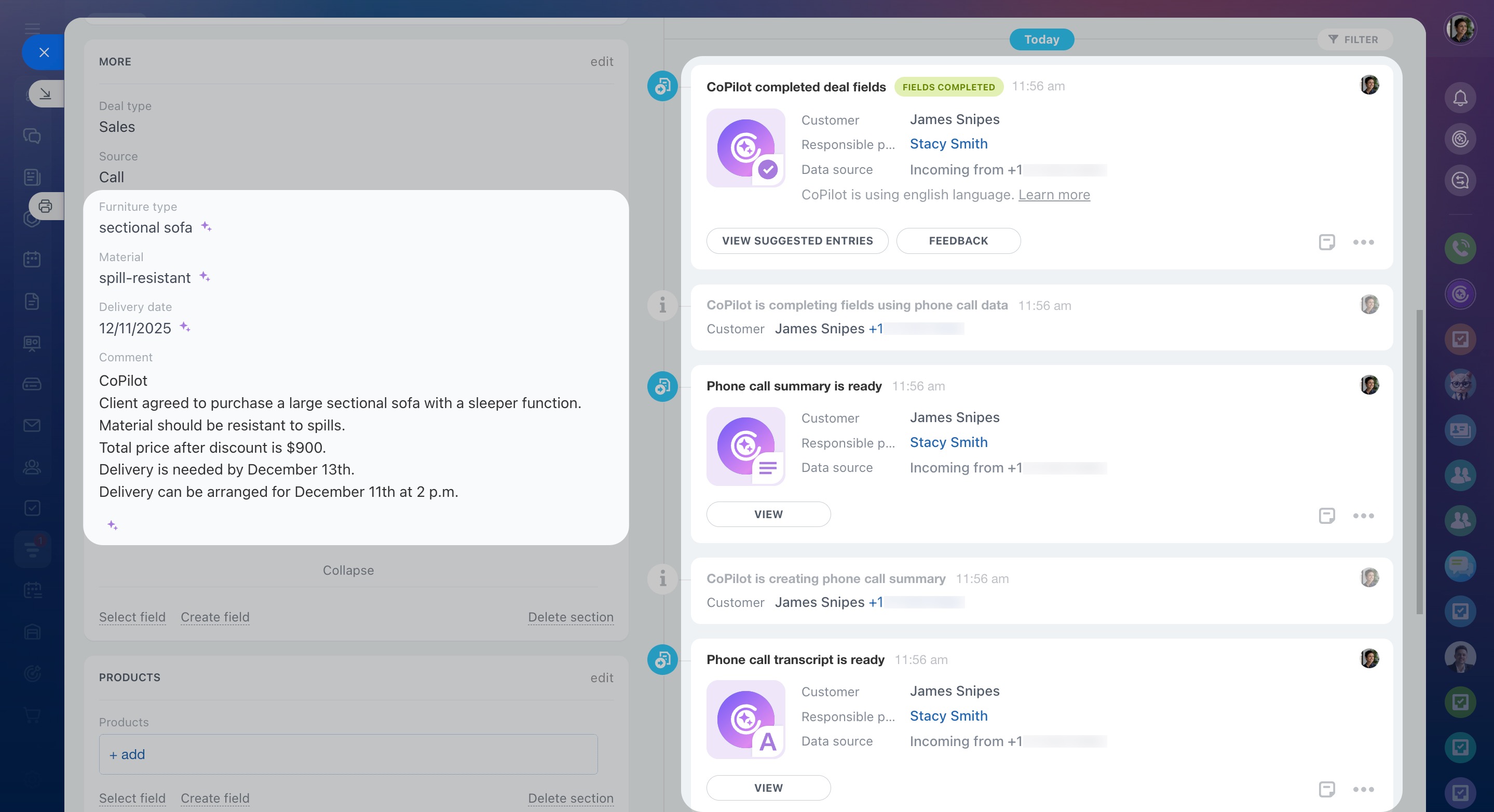 CoPilot in CRM helps employees process calls and saves valuable time on routine tasks. Without CoPilot, you need to listen to the call recording, check all vital information, and enter this data to the deal form. To make it easier, CoPilot can transcribe call recordings, create a call summary, and auto complete the fields in the deal form.