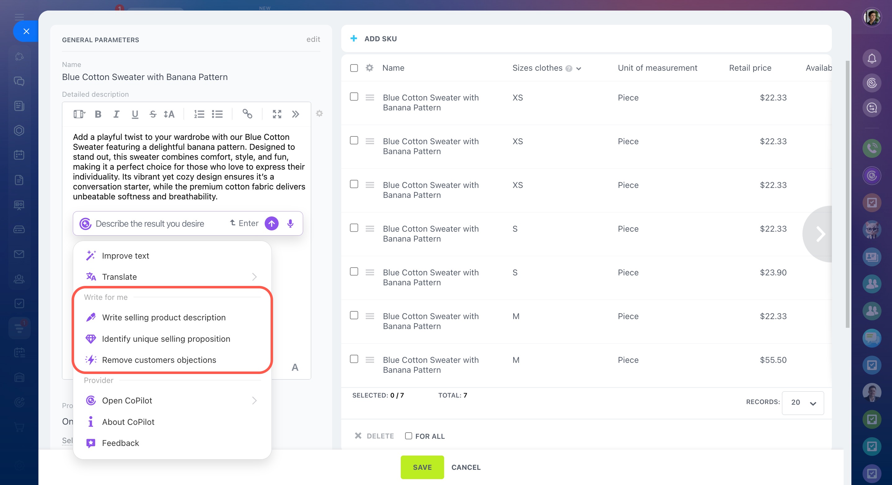 CoPilot in the product catalog assists in creating descriptions and highlighting product advantages.