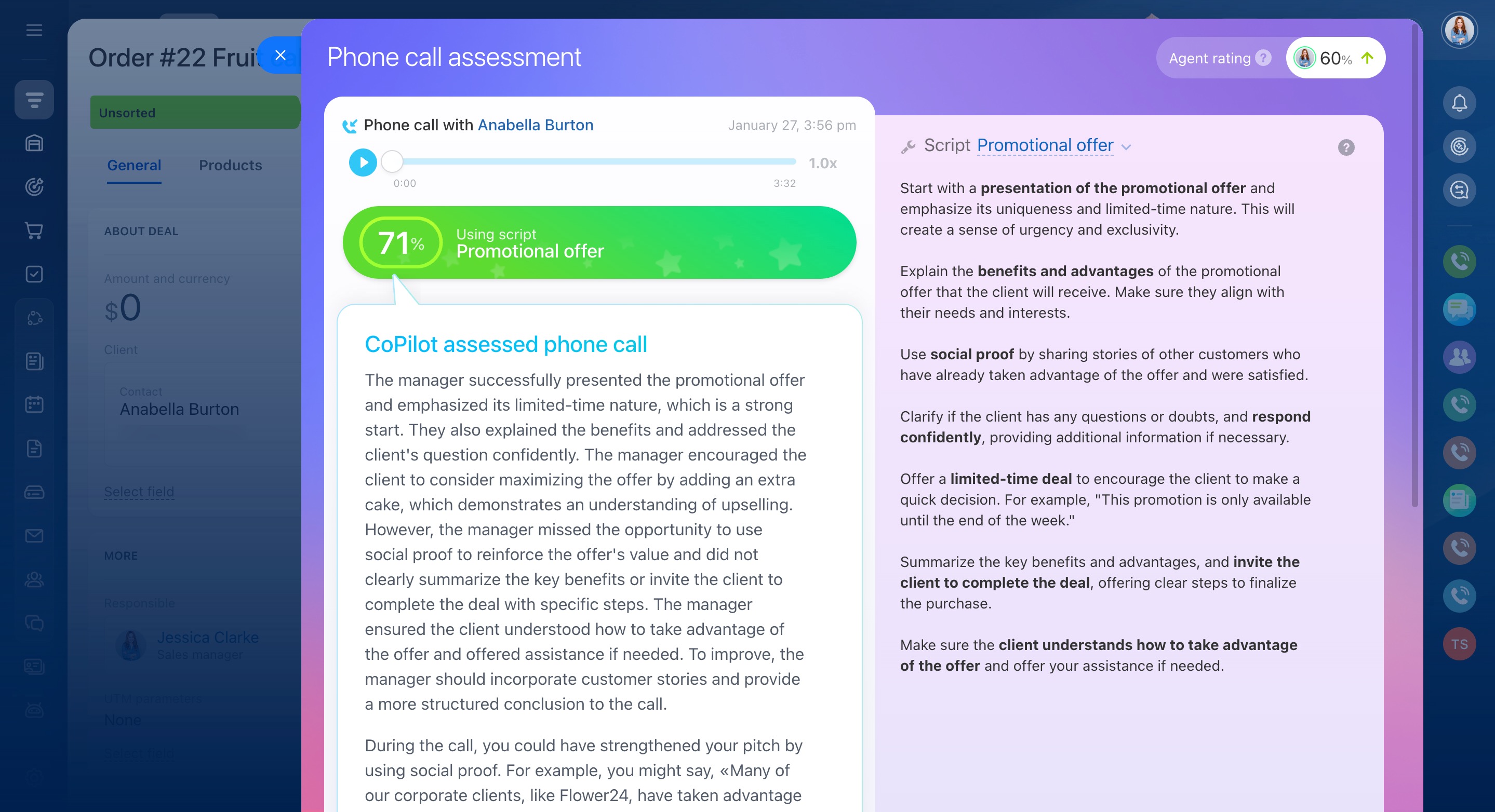 Bitrix24 now offers new CoPilot features in CRM: AI Speech analytics and Sales scripts. With CoPilot, you can analyze your agents' customer calls, compare them to scripts, and get improvement tips.