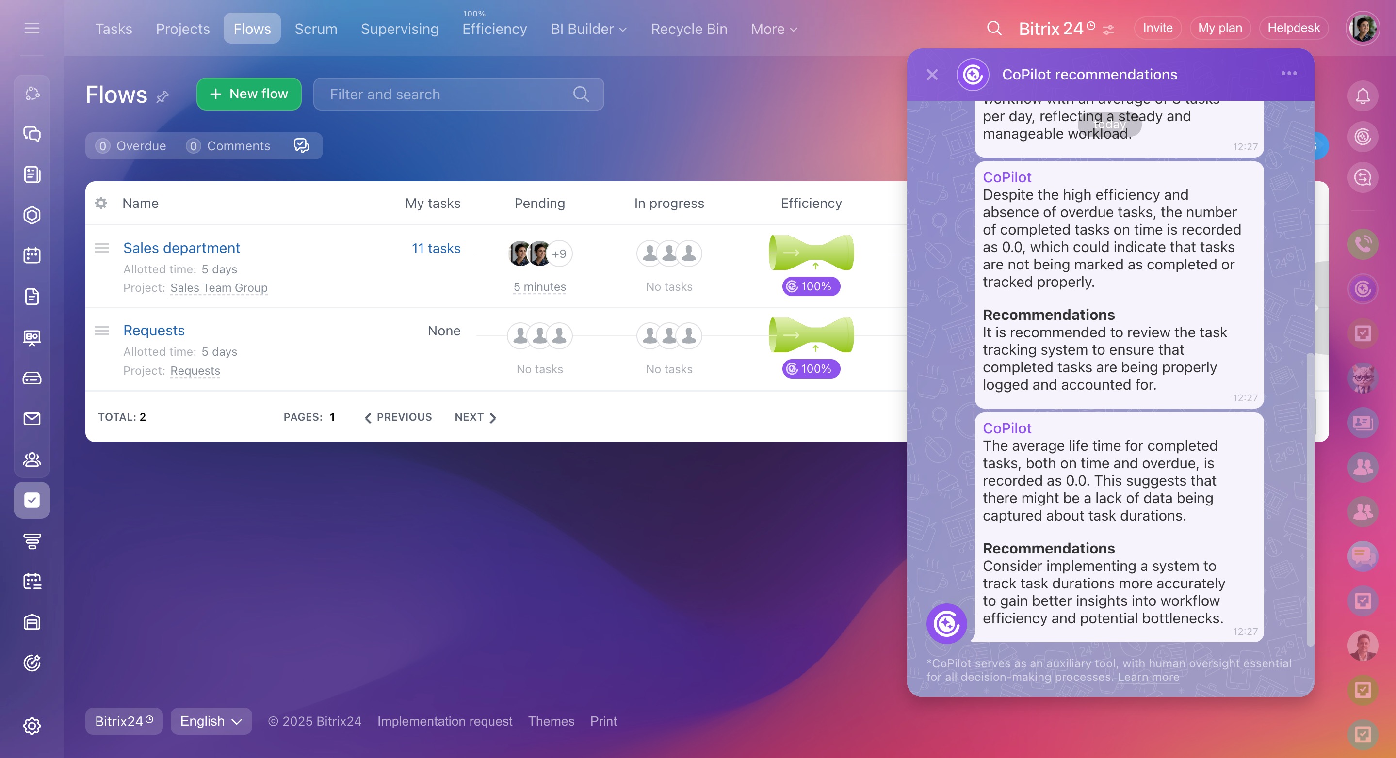 Bitrix24 Flows now have an AI assistant called CoPilot. It will analyze the flow, identify the reasons for reduced efficiency, and prepare recommendations for the process improving.