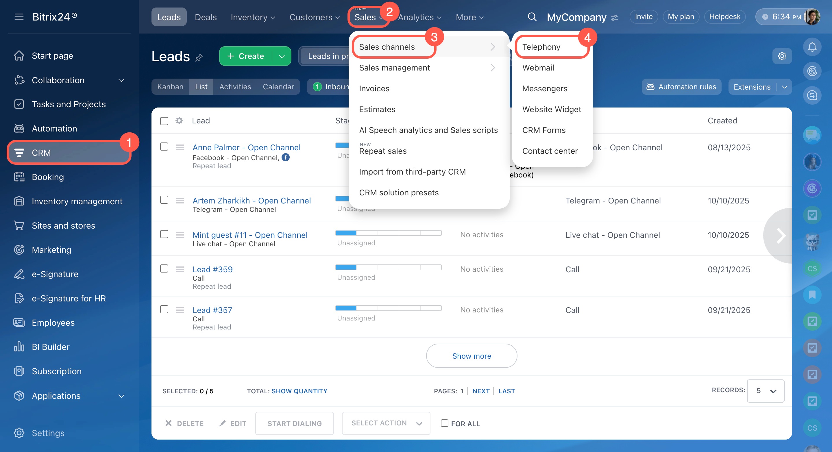 Use Bitrix24 Telephony to interact with your potential customers. To avoid adding contacts manually, set up telephony integration with CRM. Convert calls from new numbers into CRM items and store calls from existing customers in their corresponding items.