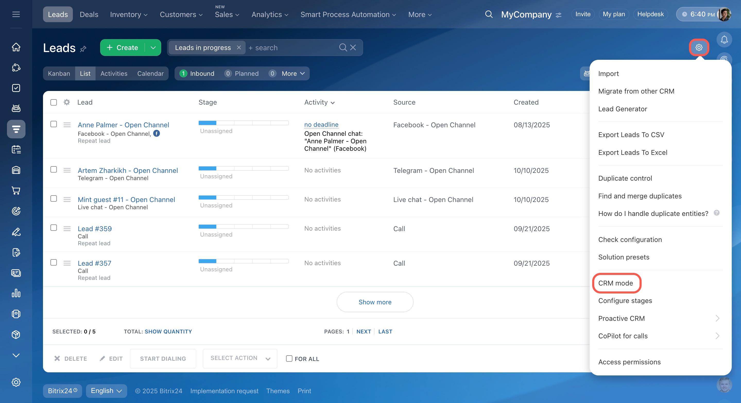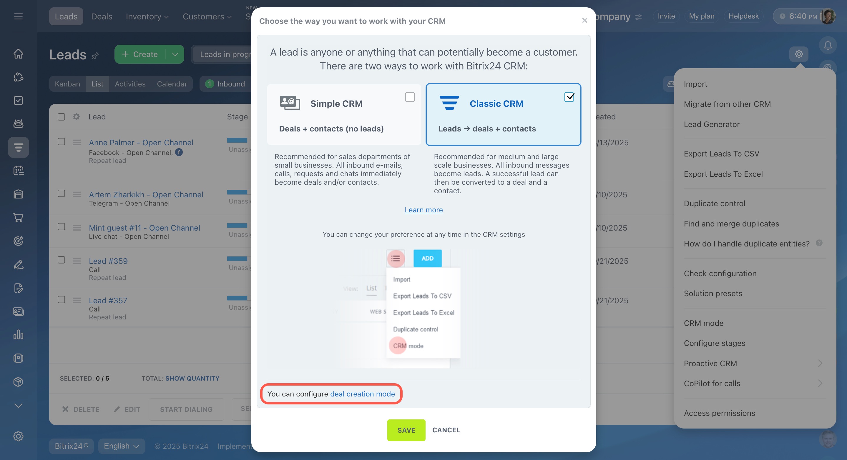 There are two ways to work with Bitrix24 CRM: Simple CRM (without leads) and Classic CRM (with leads).