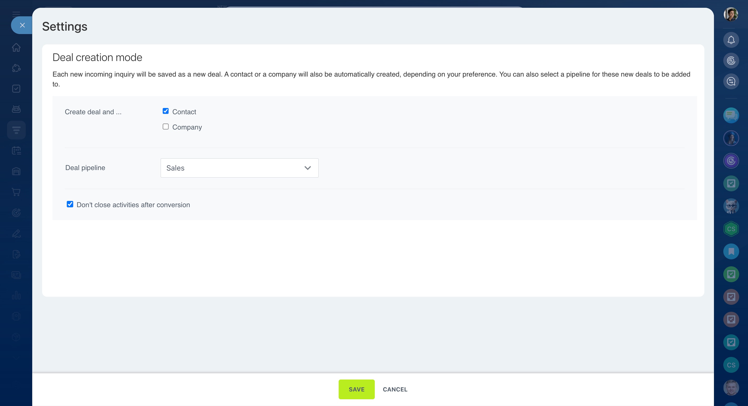 Decide if you want to create contact or company along with a deal. Select the desired options in the Deal creation mode section.