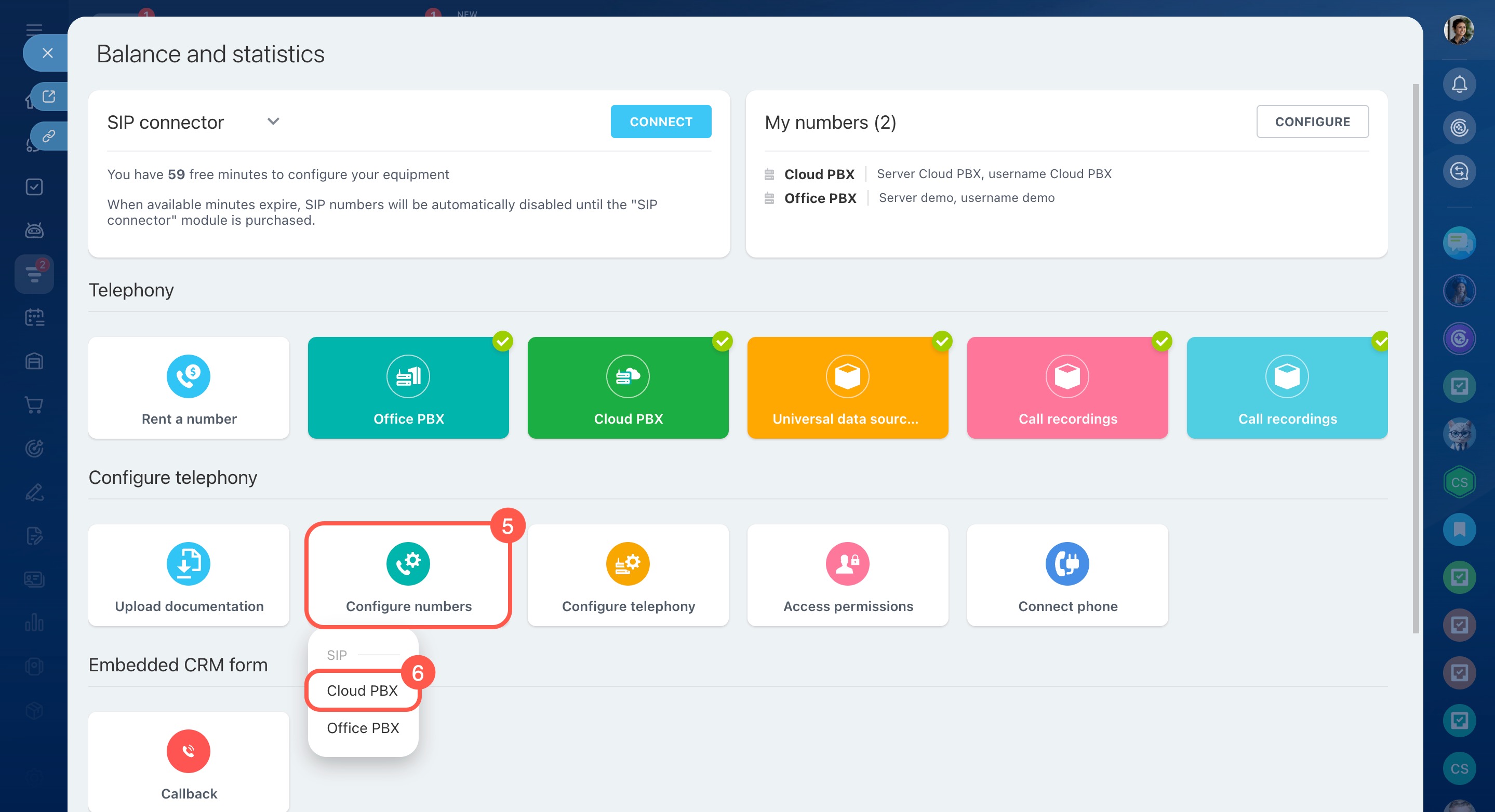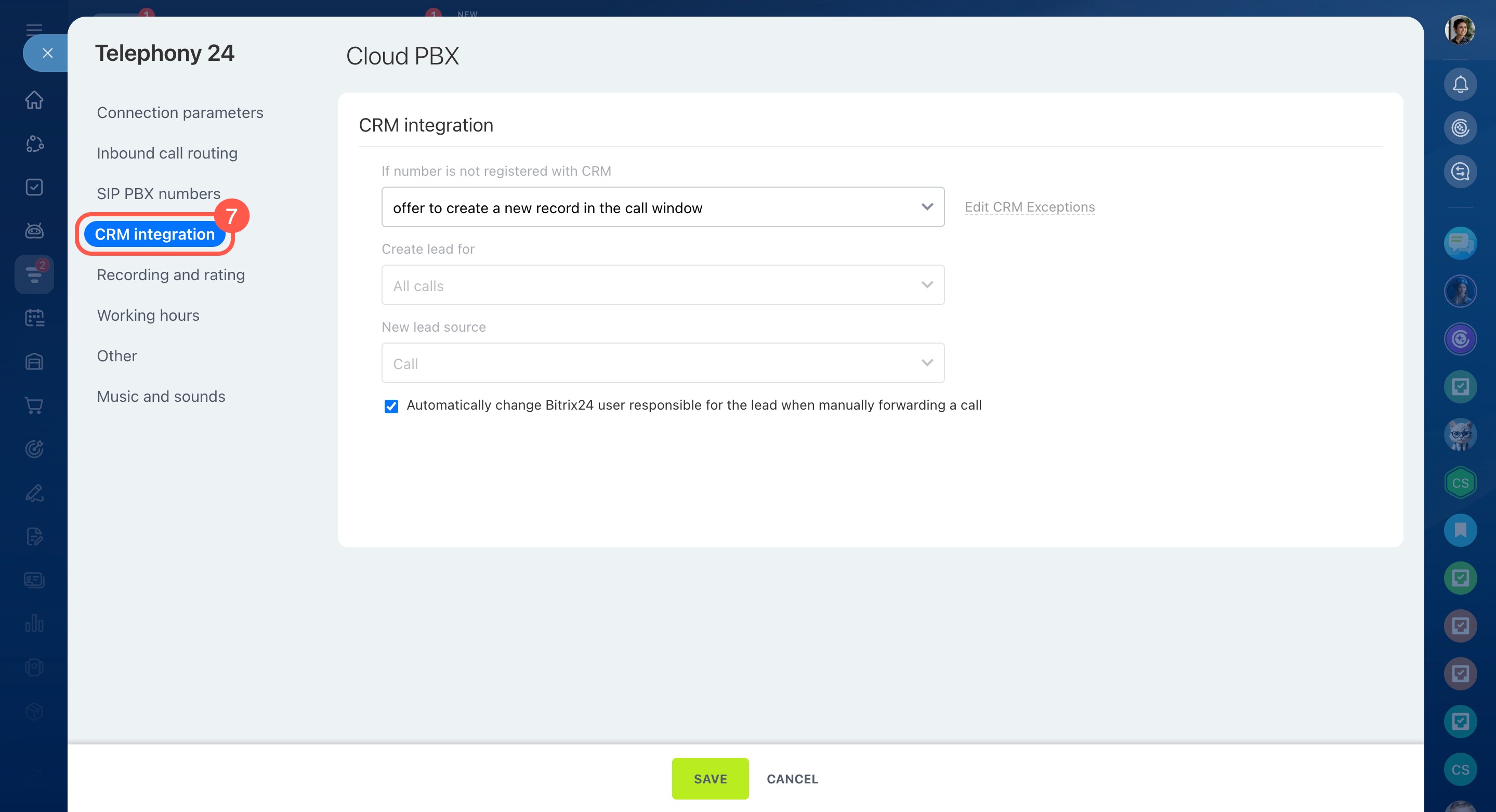 Process calls in CRM when using a rented number or SIP PBX in Bitrix24. Go to Telephony > Connection > Configure numbers > CRM integration to adjust the settings.