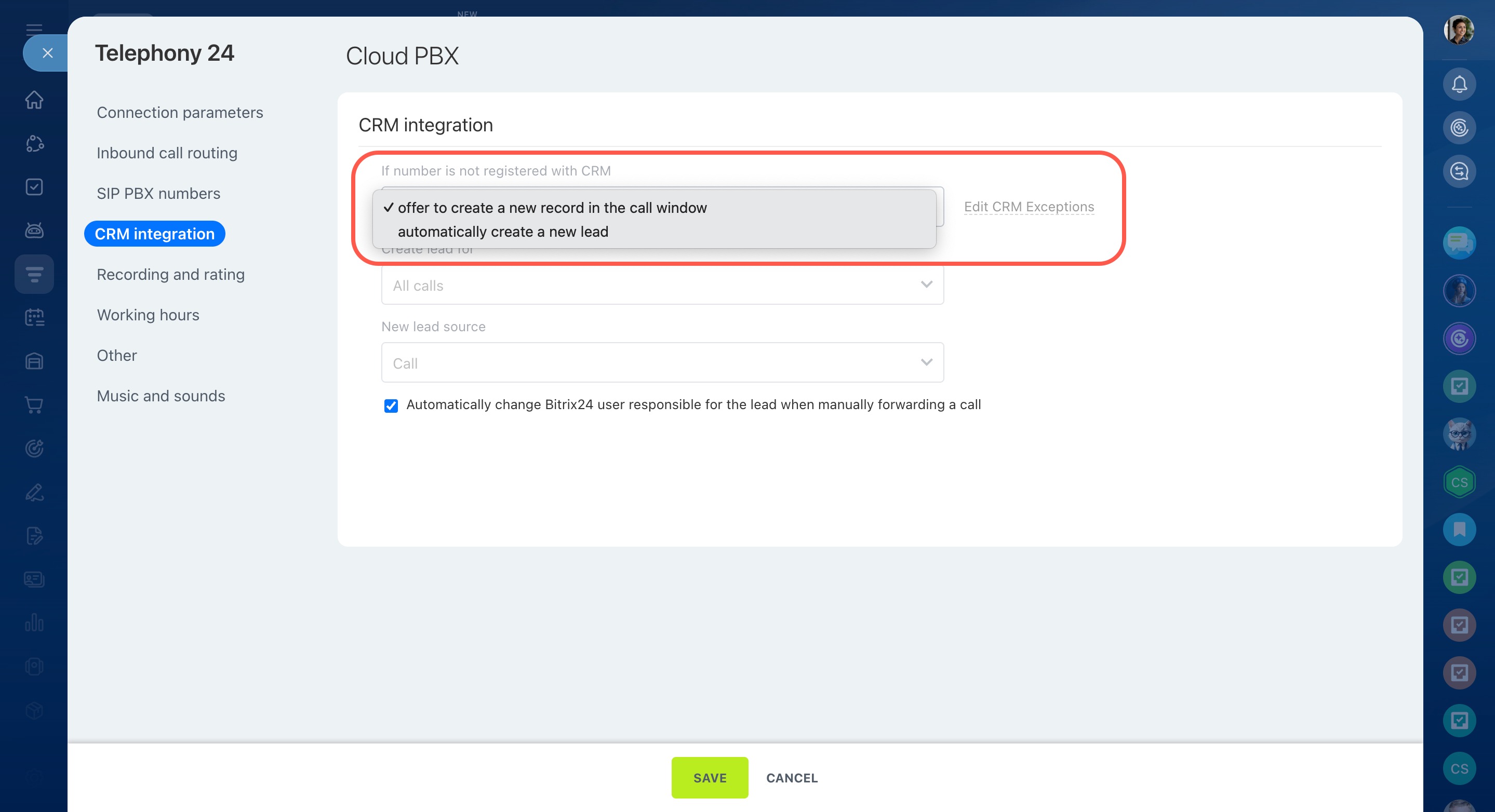 You can make the system automatically create new leads or suggest creating CRM items in the active call window. Select the option you need under If the number is not found in CRM:
