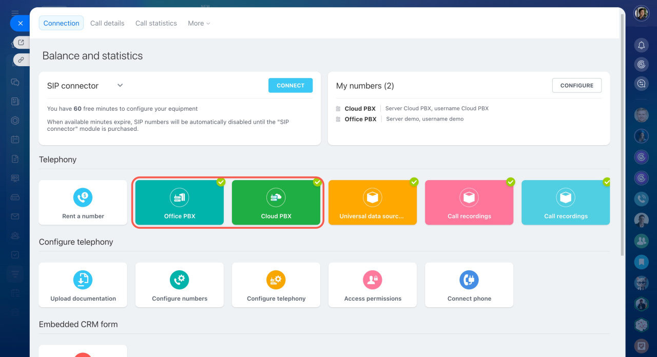Also, you have 60 free minutes available to make outbound calls and test the functionality. After the free minutes are over, you need to purchase the SIP connectorSIP connector is a special software module of Bitrix24. It allows you to direct all outbound and forwarded calls from Bitrix24 to your SIP PBX. license to continue working with outbound calls.