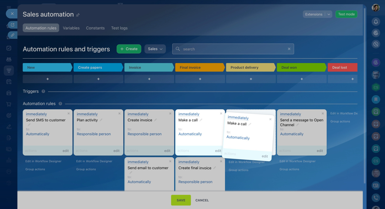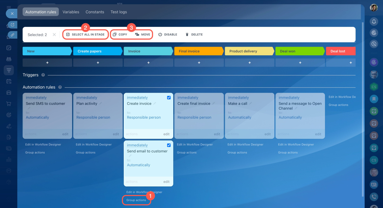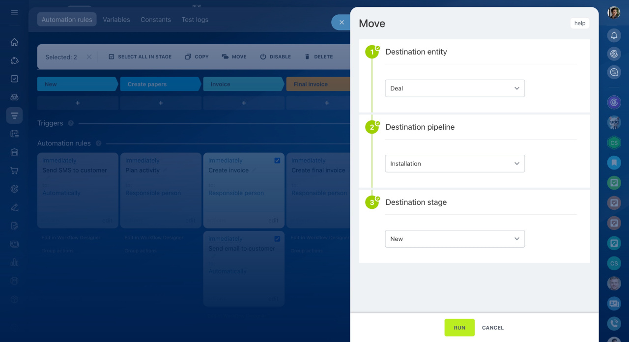 Move or copy automation rules between stages, pipelines, and CRM entity types.
