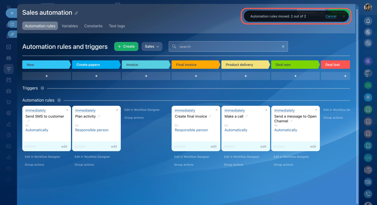 Go to the Sales automation page and use the actions described below for one or multiple automation rules.