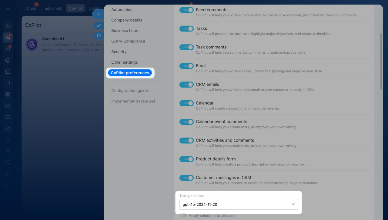 They are specified in Bitrix24 account settings. Open the CoPilot preferences tab and check the providers in each section.