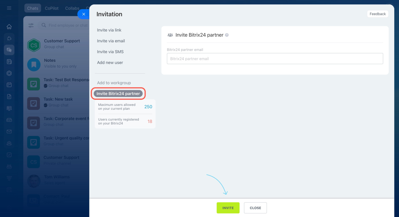 Invite a partner to your Bitrix24 only via the Invite Bitrix24 partner option