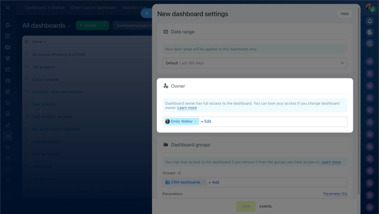 You can change the owner in the dashboard settings. Only the owner or an employee who has permission to edit dashboards can do this. Select the desired dashboard from the list, open the settings, and specify the new owner.