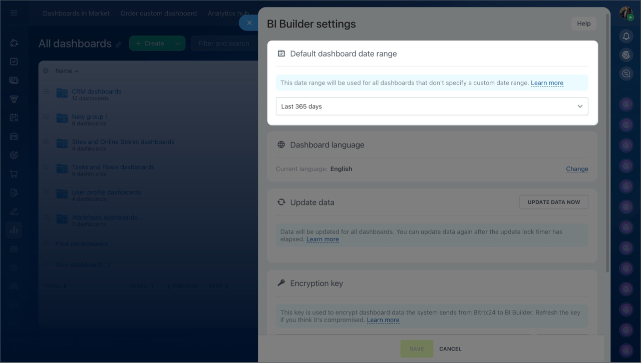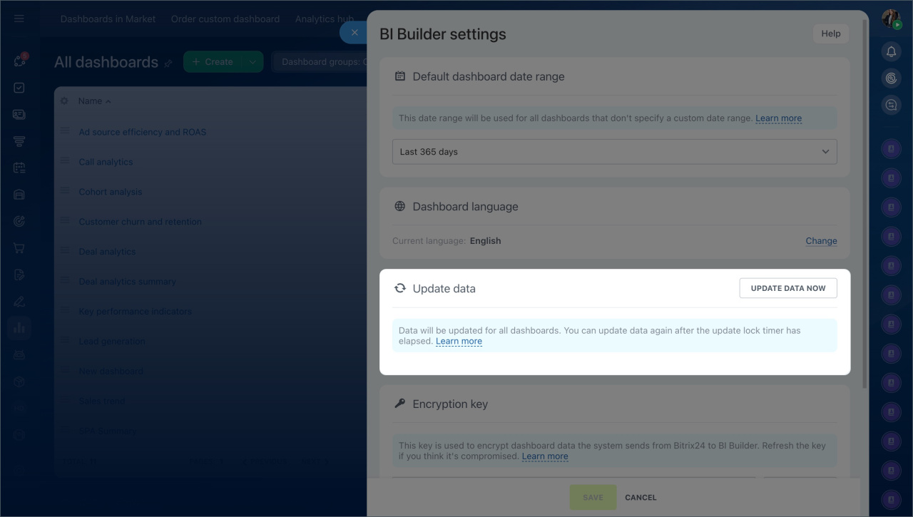 Encryption key. The key is a unique identifier that binds data from Bitrix24 to BI Builder. If you think someone outside your team knows the key, refresh it to keep your data safe.