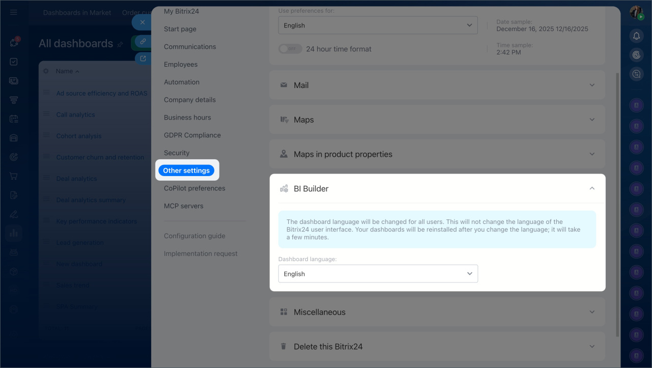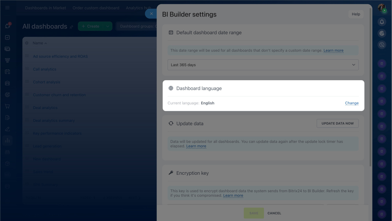 Report language. In the settings, you can select the language for displaying metrics, chart labels, and interface elements within BI Builder reports. To change the language, click Change, select the appropriate one from the list, and save the changes.