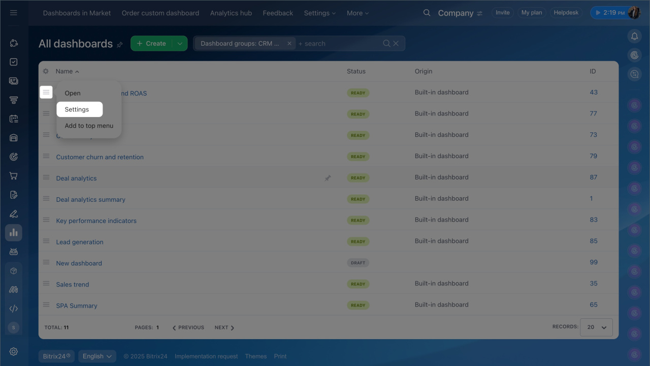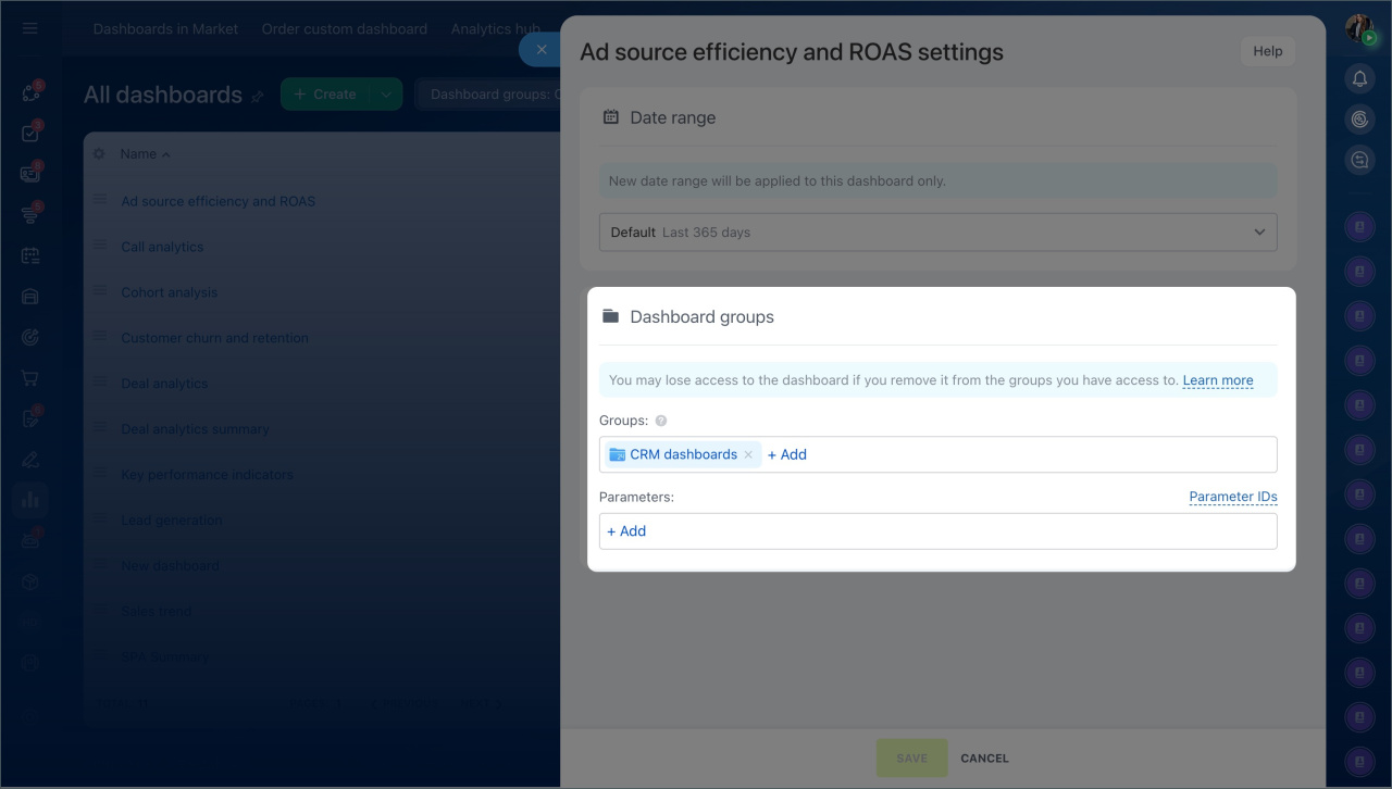 Dashboard groups. Open the report settings, specify the parameters, and select the Bitrix24 sections where the specific report will be displayed. Groups are collections of reports on a single topic. Bitrix24 offers predefined groups for reports from the Market and built-in dashboards. Each group is linked to a specific section or tool. Parameters are variables that allow you to filter data or display the required values in the report.