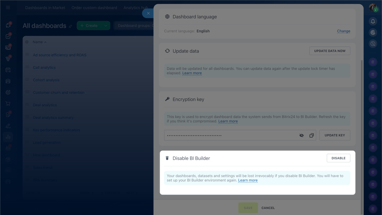 Disable BI Builder. If you switch to the Basic or Free plan, you can manually disable BI Builder. Be aware that this will delete all user dashboards, datasets, and settings. If you upgrade to a suitable plan later, you'll need to set up your dashboards again. Note that you can only re-enable BI Builder after 24 hours.