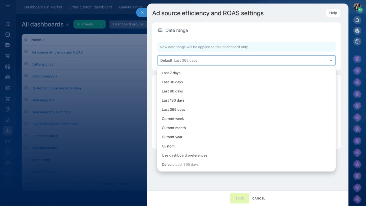 Default dashboard date range. Set the date range of the data to be displayed in your dashboards, like a year, a month, a week, or another one. If you don't set a date range, the dashboard will show data for a year by default.