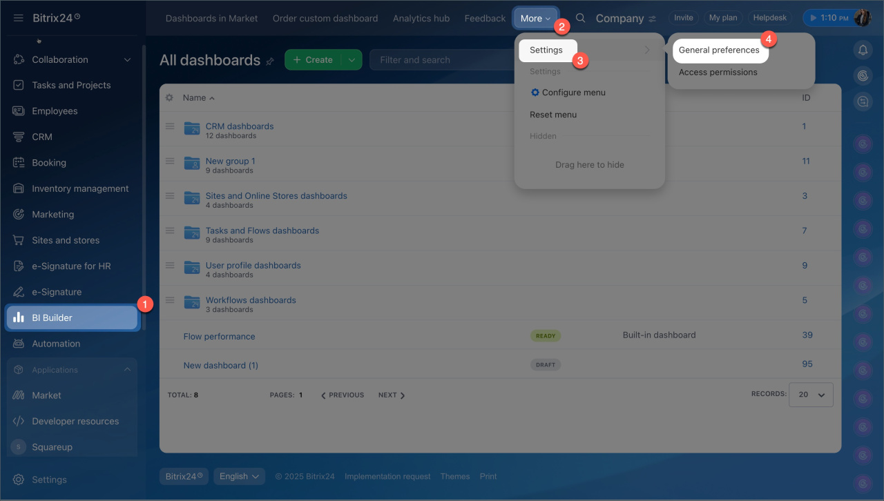 To access BI Builder settings, go to BI Builder > Settings > General parameters.