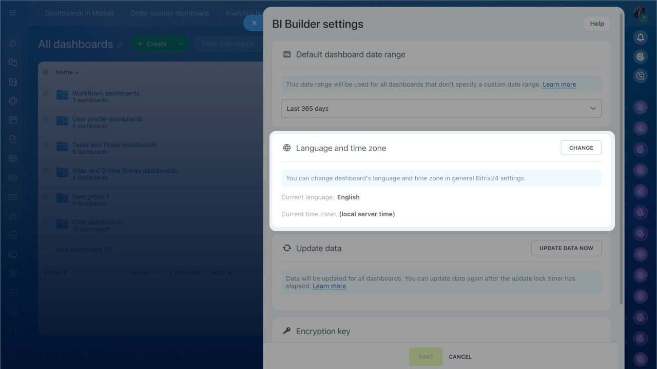 Report language. In the settings, you can select the language for displaying metrics, chart labels, and interface elements within BI Builder reports. To change the language, click Change, select the appropriate one from the list, and save the changes.