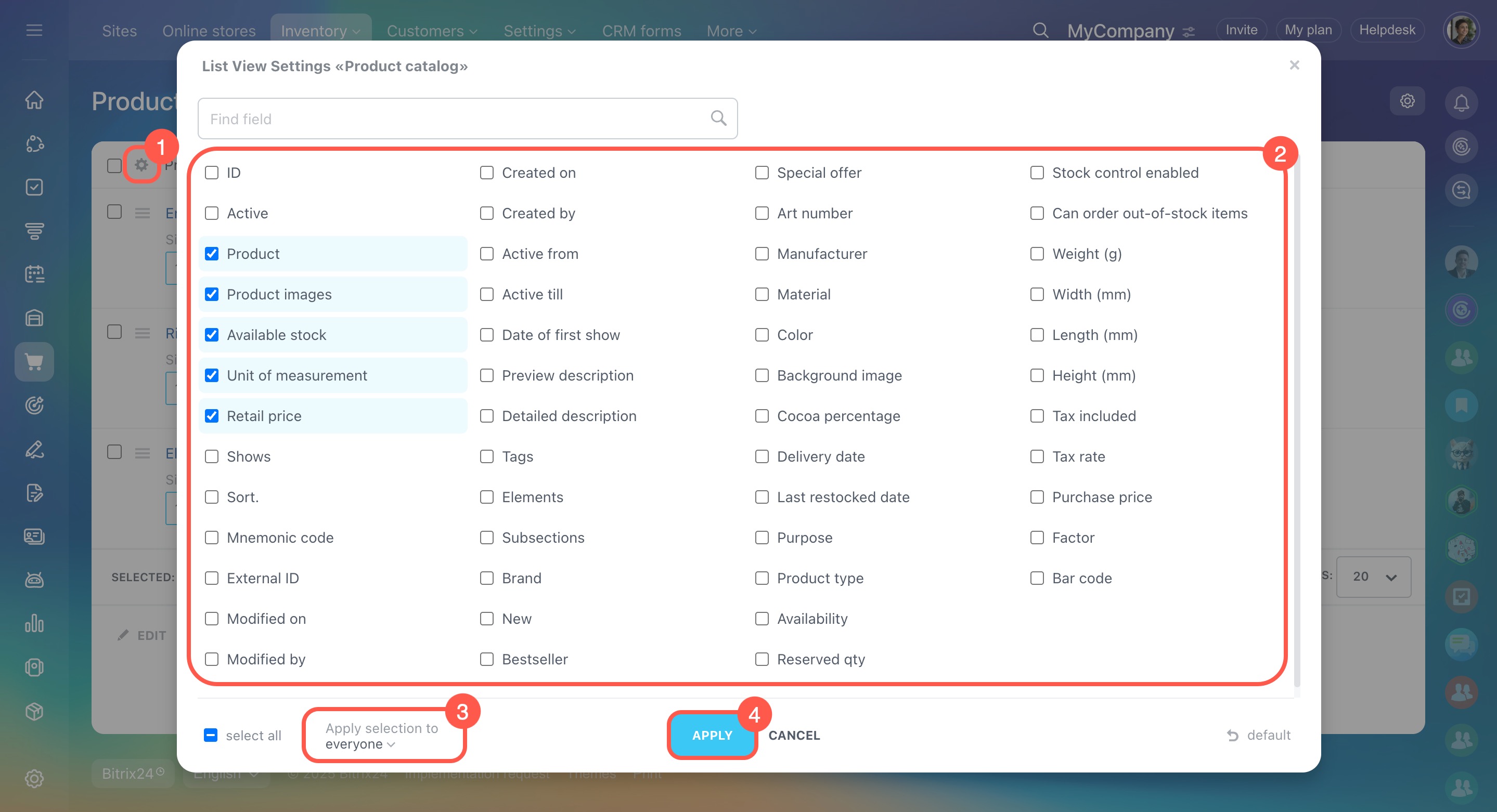 Click the Settings icon and select which fields you want to display in the product catalog. Then click Apply.