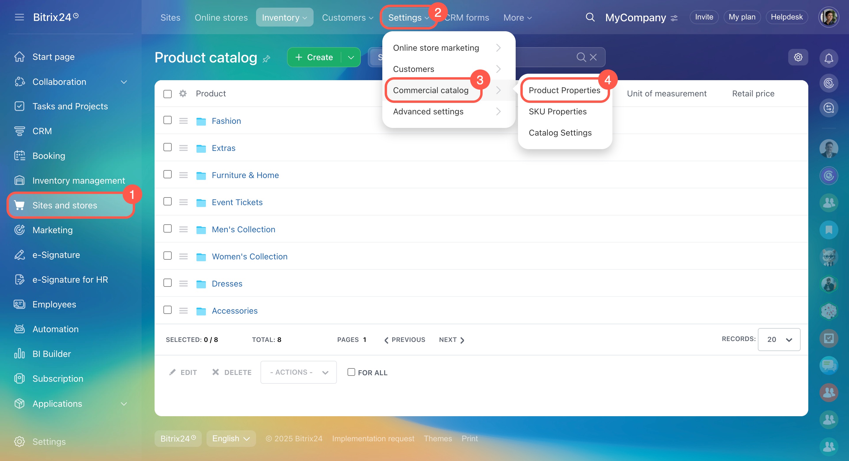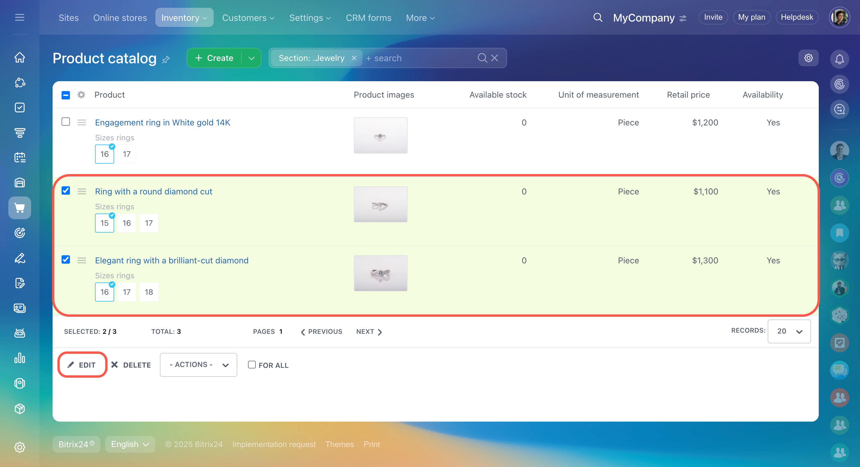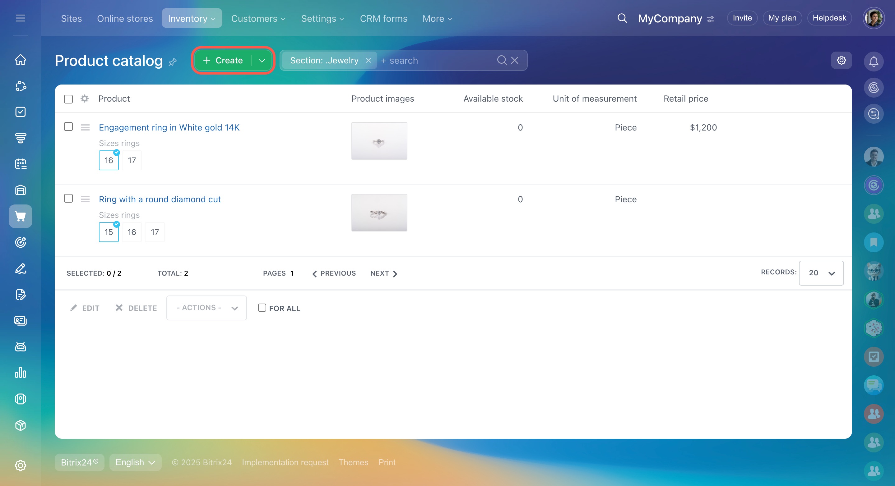 - Bitrix24 has a single catalog of products for CRM and online stores. When you create a page in your online store, you can quickly fill it with products from the catalog. When you work with customers in CRM, you can add products to an invoice or an estimate.