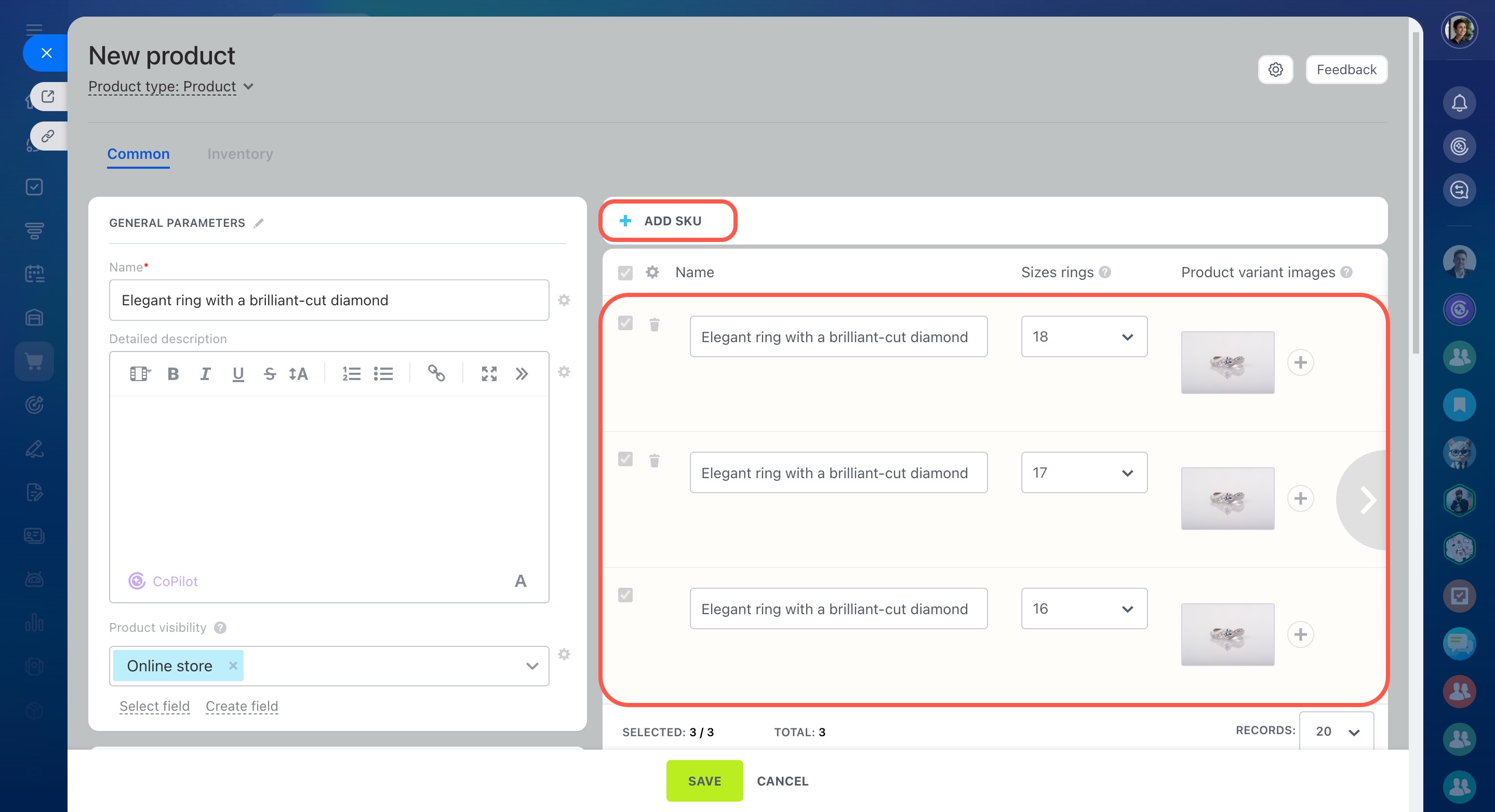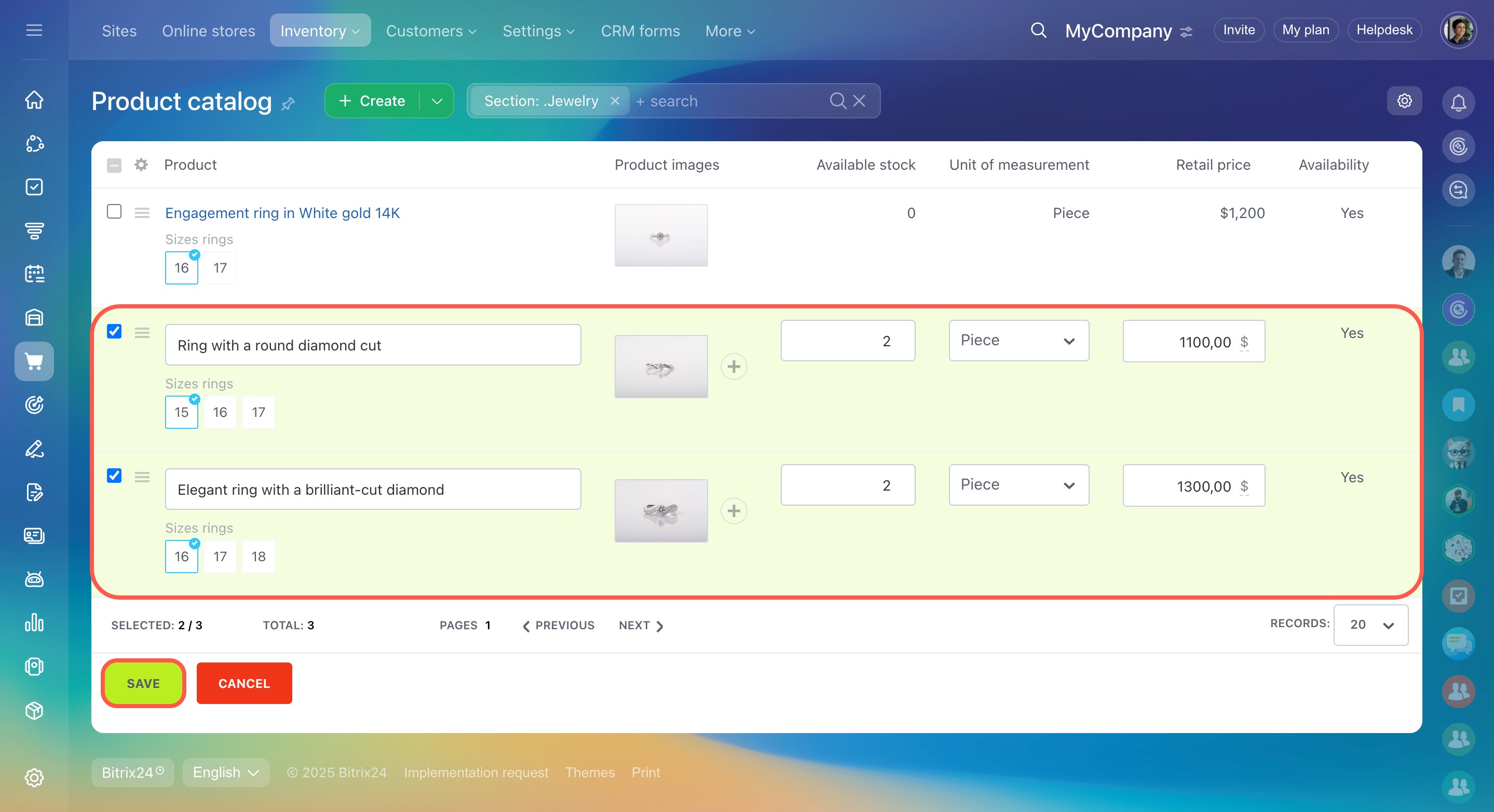 Bitrix24 has a single catalog of products for CRM and online stores. When you create a page in your online store, you can add products from the catalog. When you work with customers in CRM, you can add products to an invoice or an estimate.
