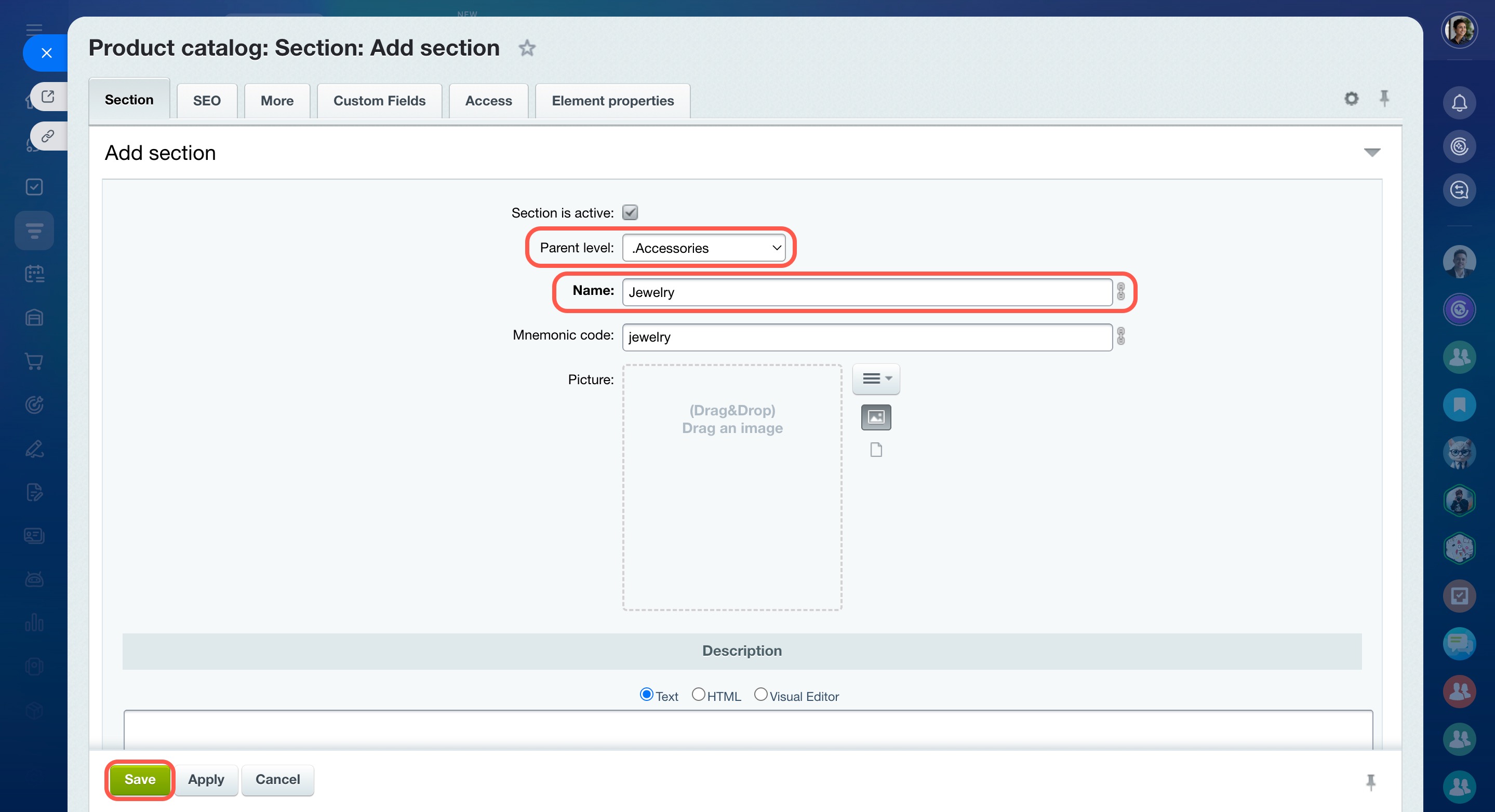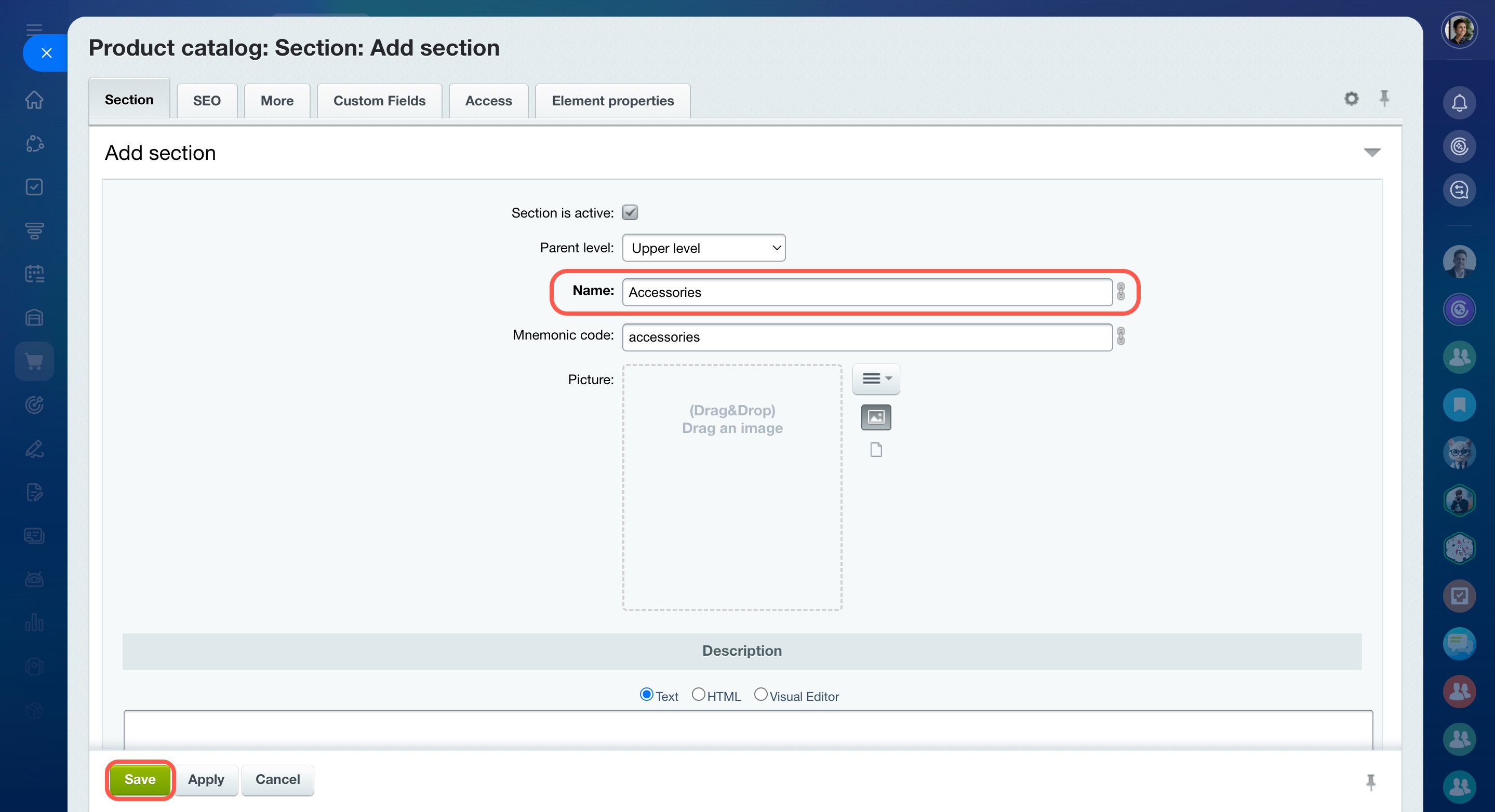 - Click Create on the Product Catalog page. Fill in the required fields, specify characteristics and price, and assign the product to a section.