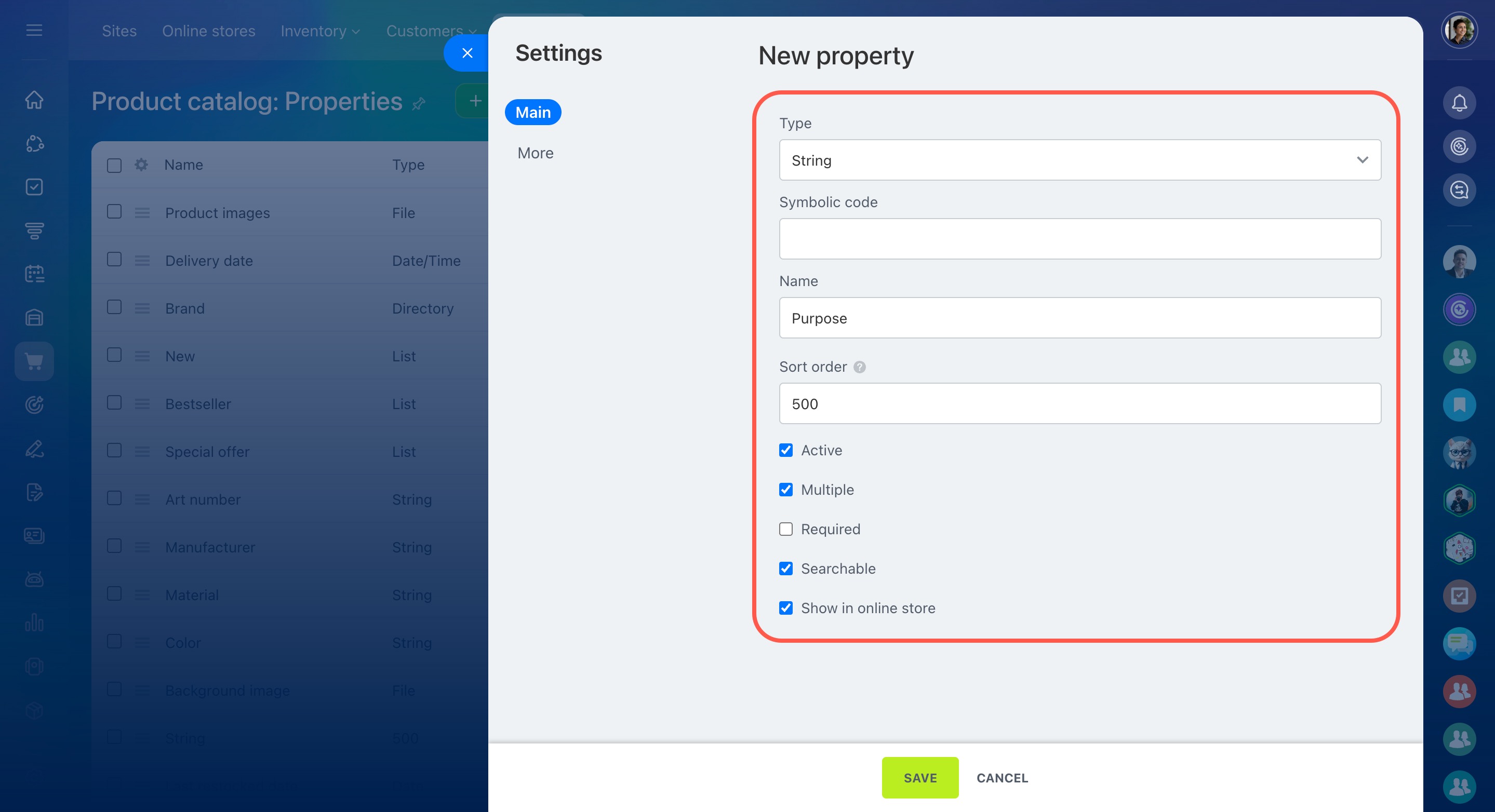 - Sort order — affects the location of the property in the online store.
