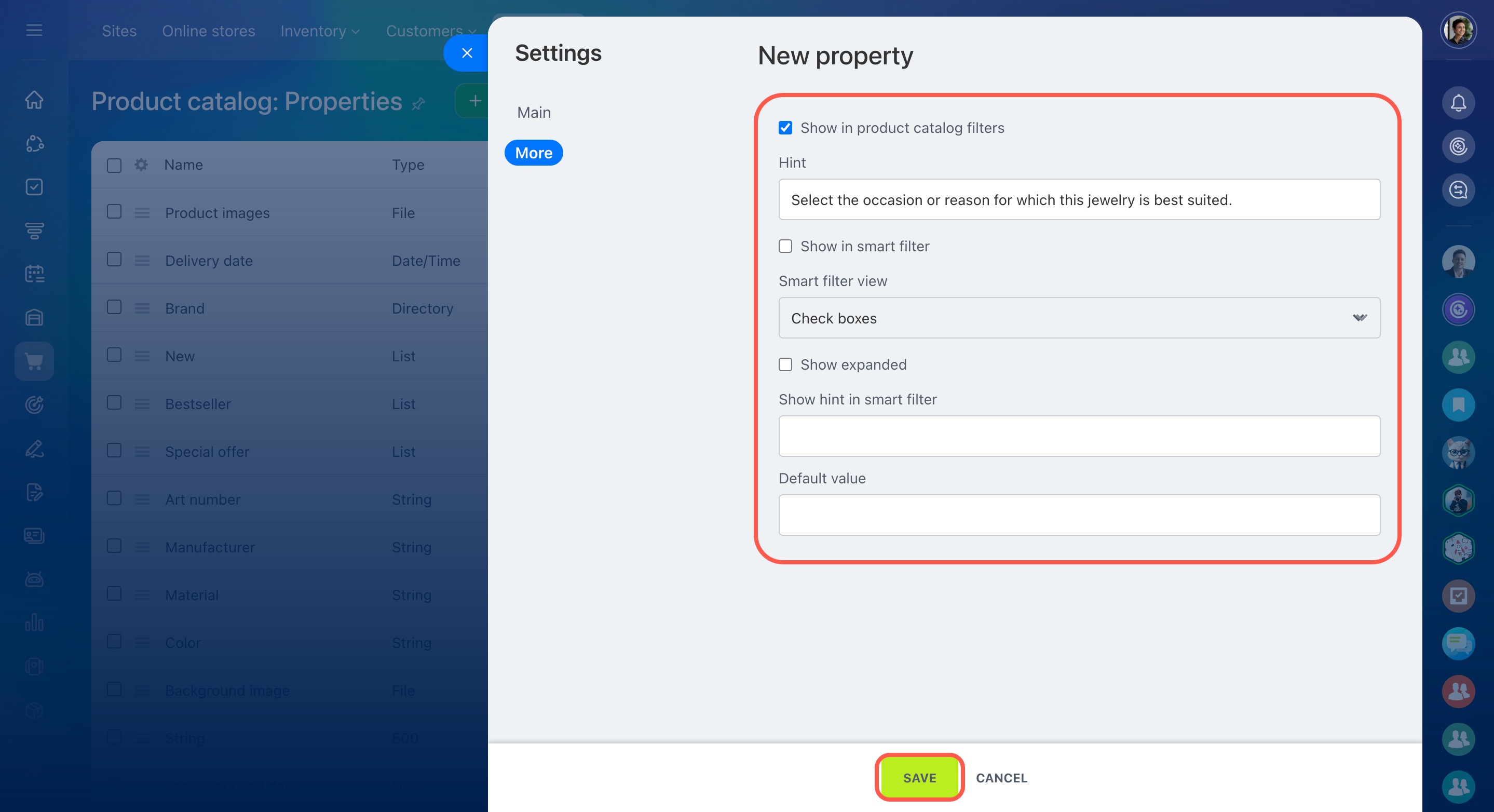 - Show in product catalog filters — the field will be displayed inside the system filter in the online store.