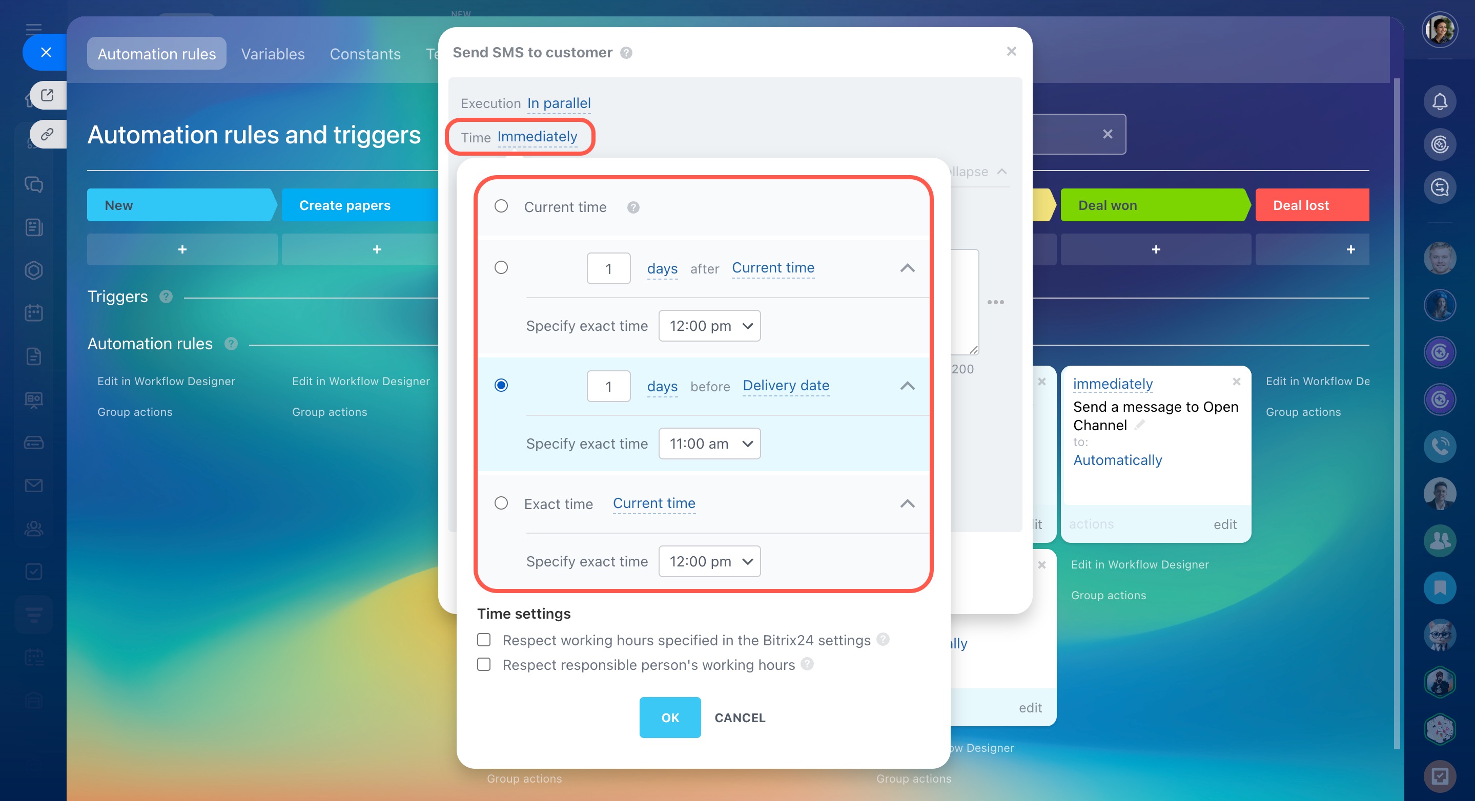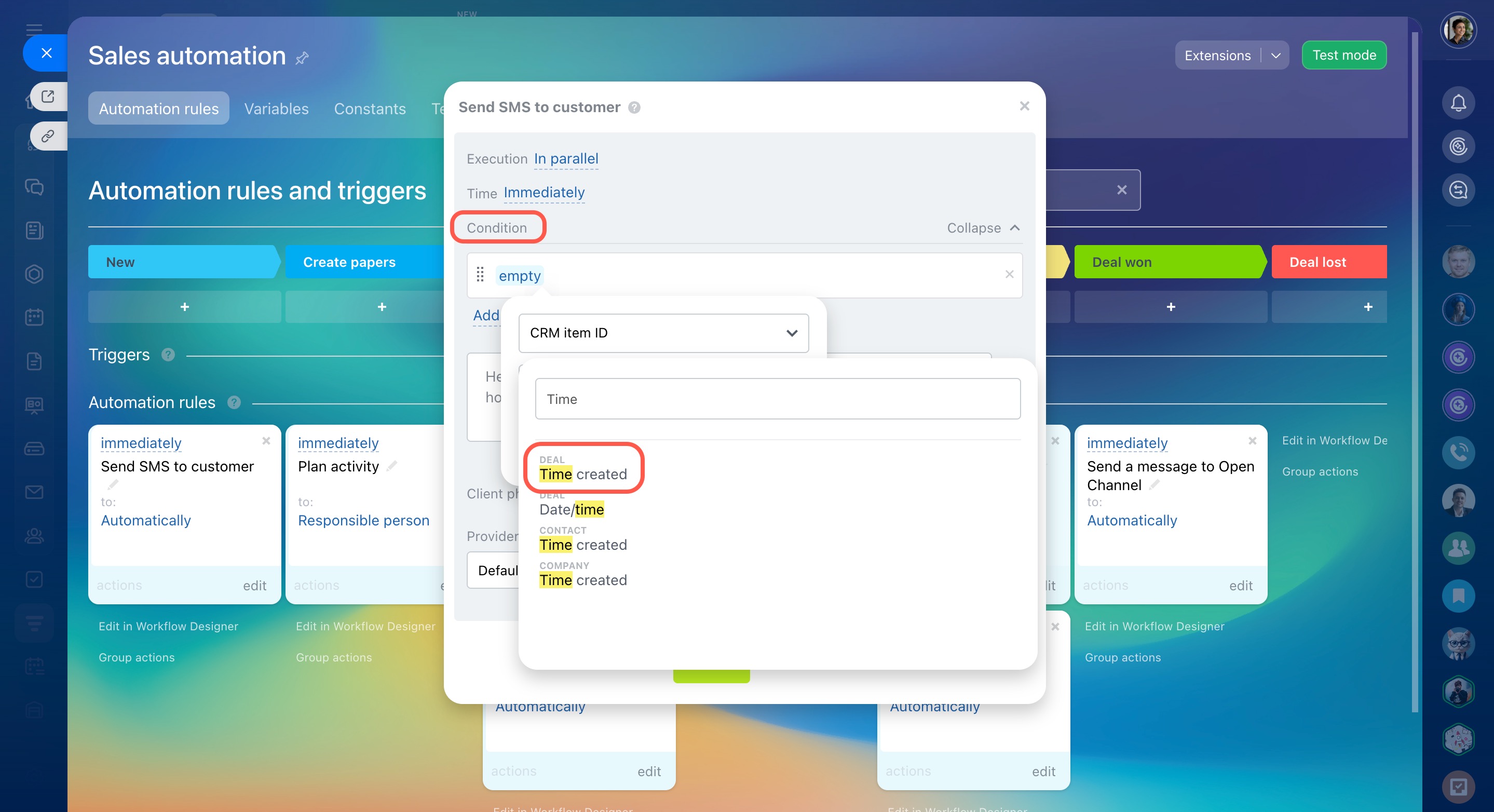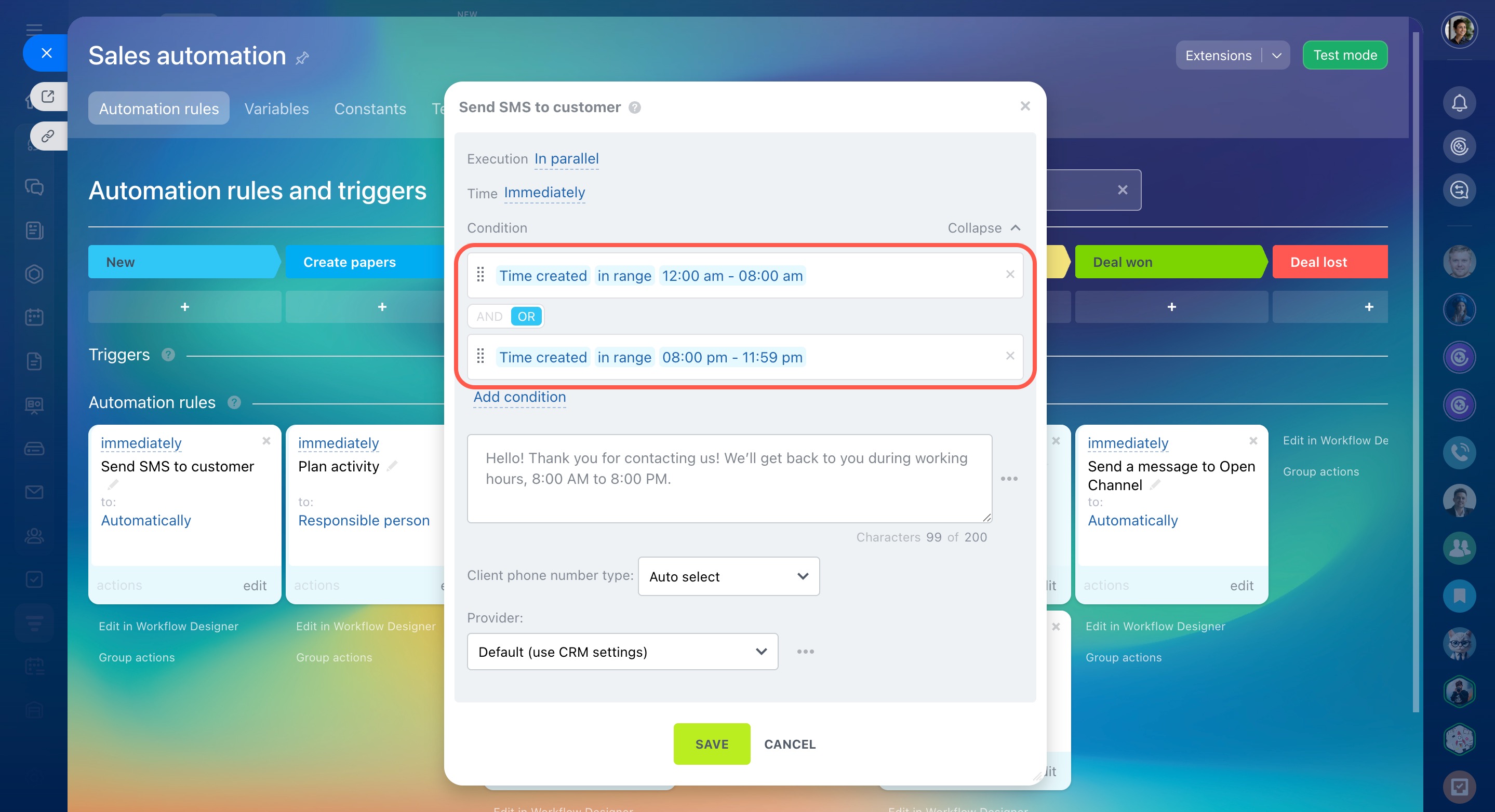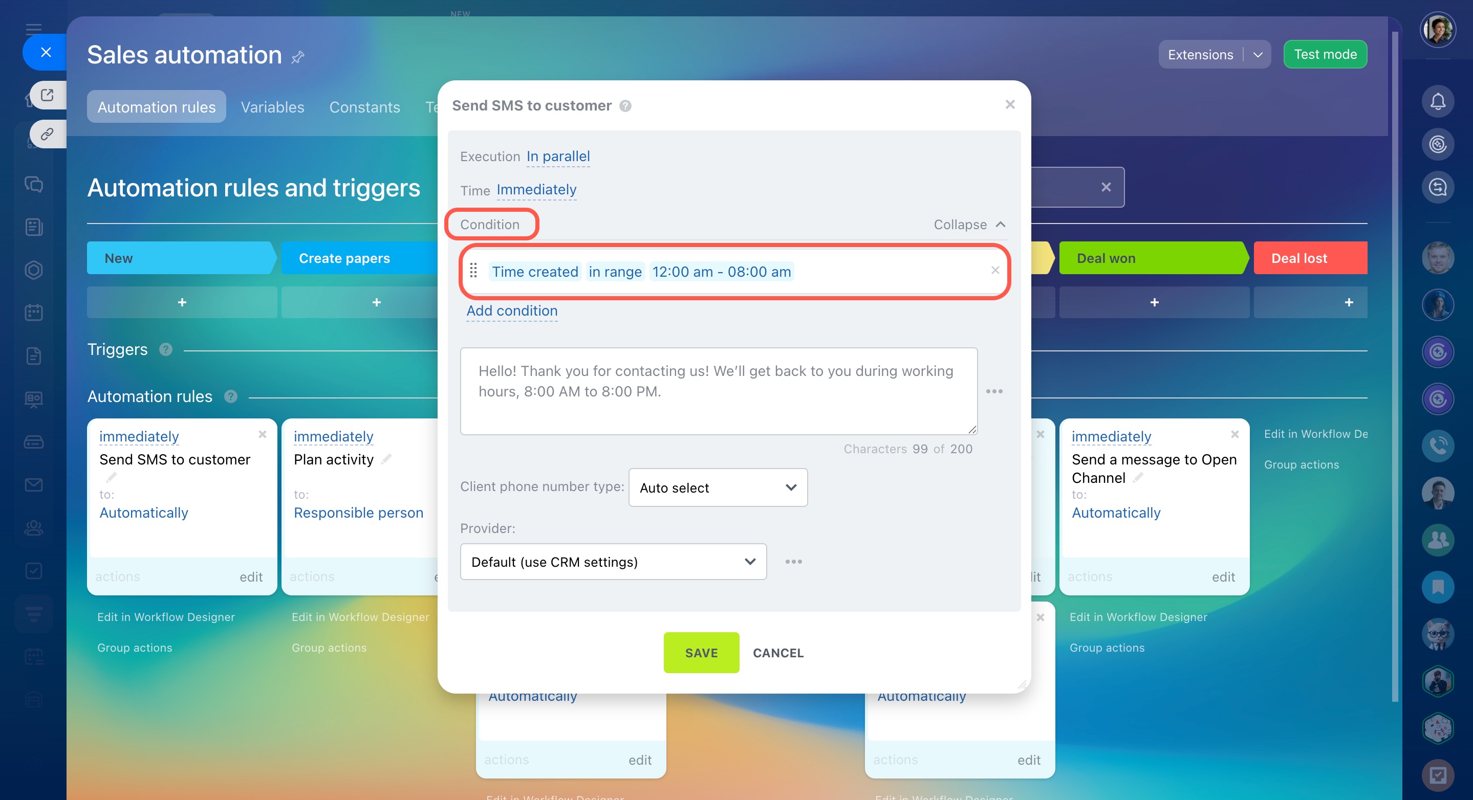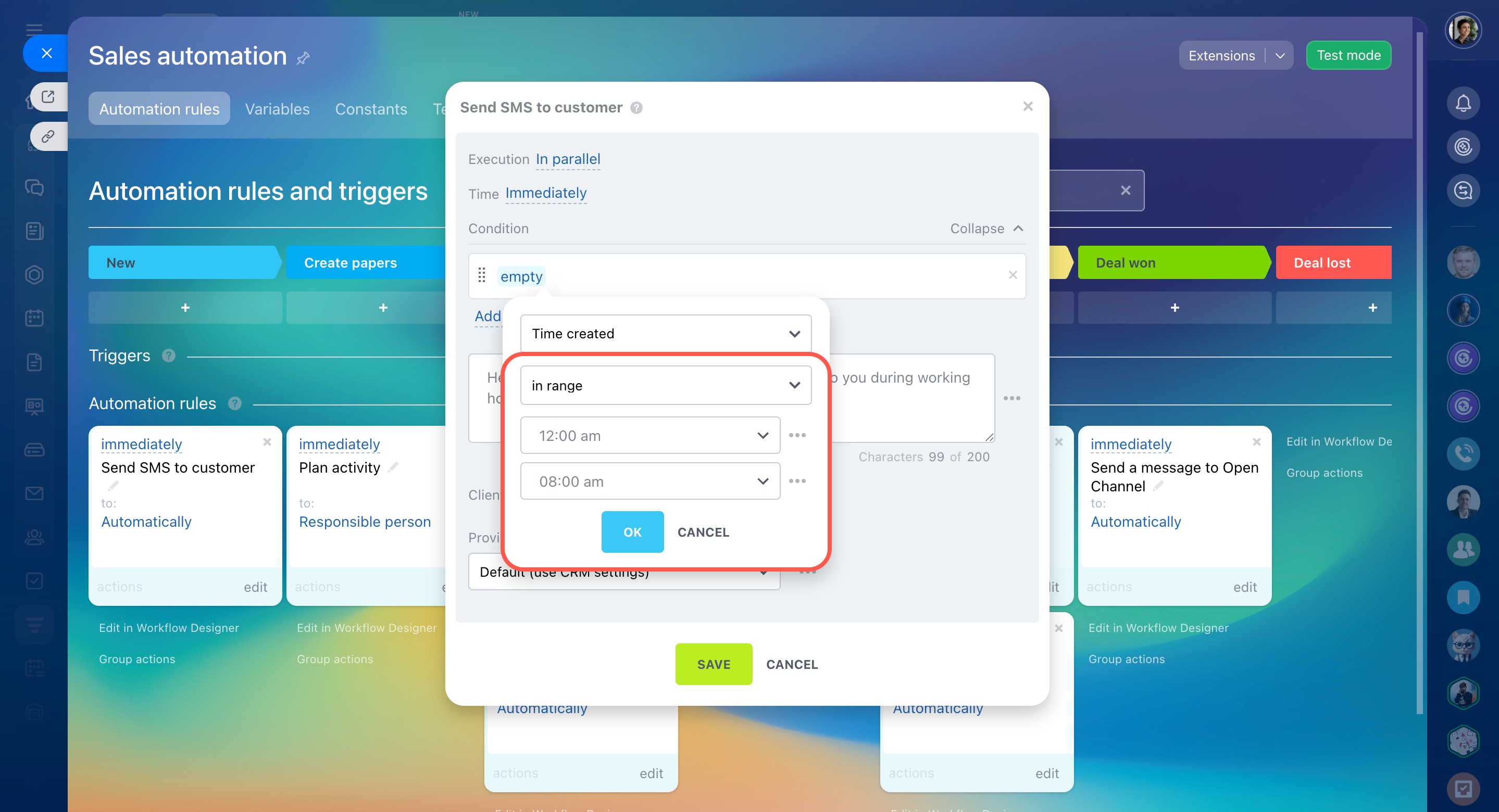To make the automation rule work only for certain items, you need to set up a condition. You can add a time range to it. For example, the automation rule will work if the time of deal creation is from 00:00 to 08:00.