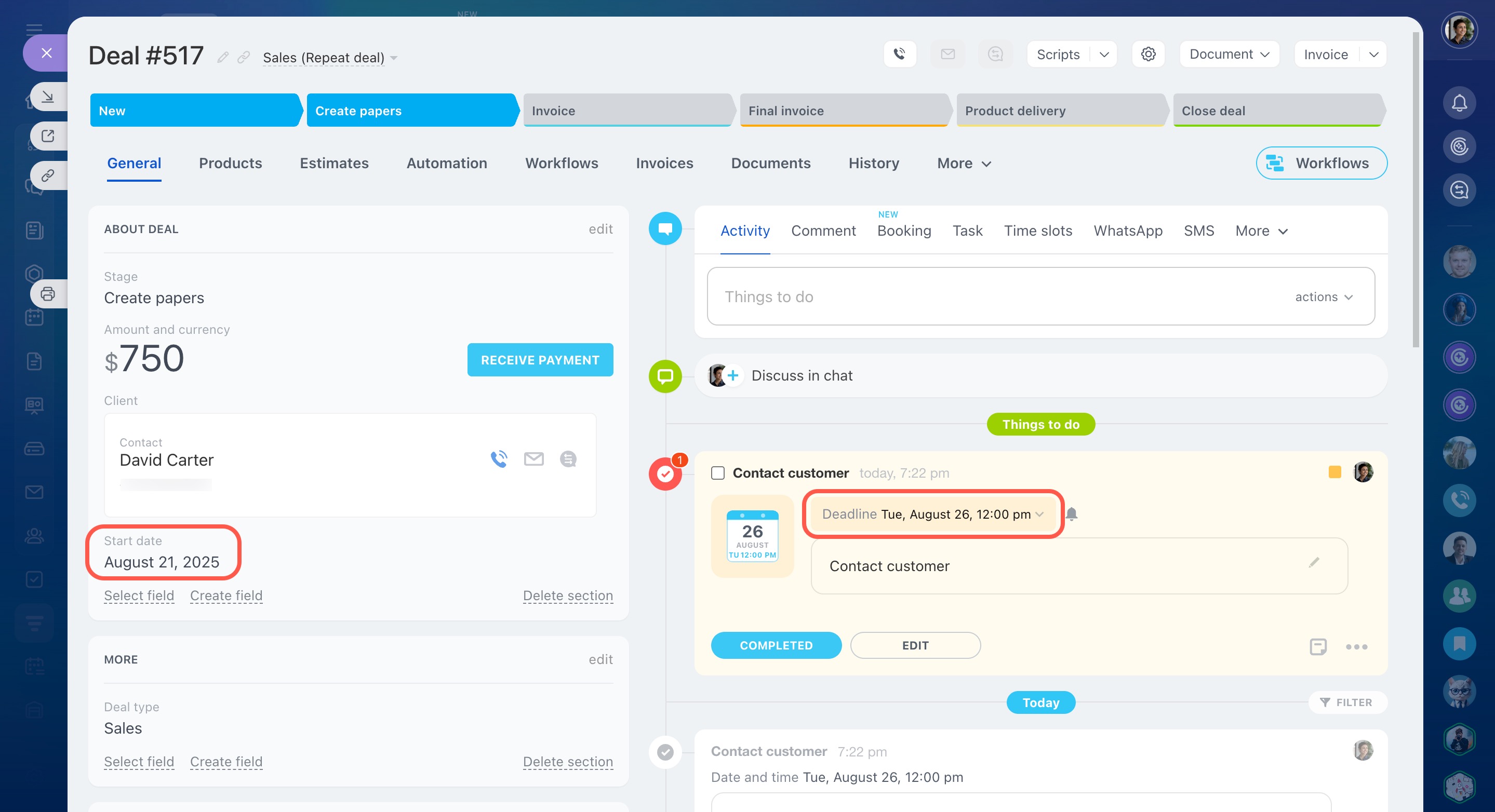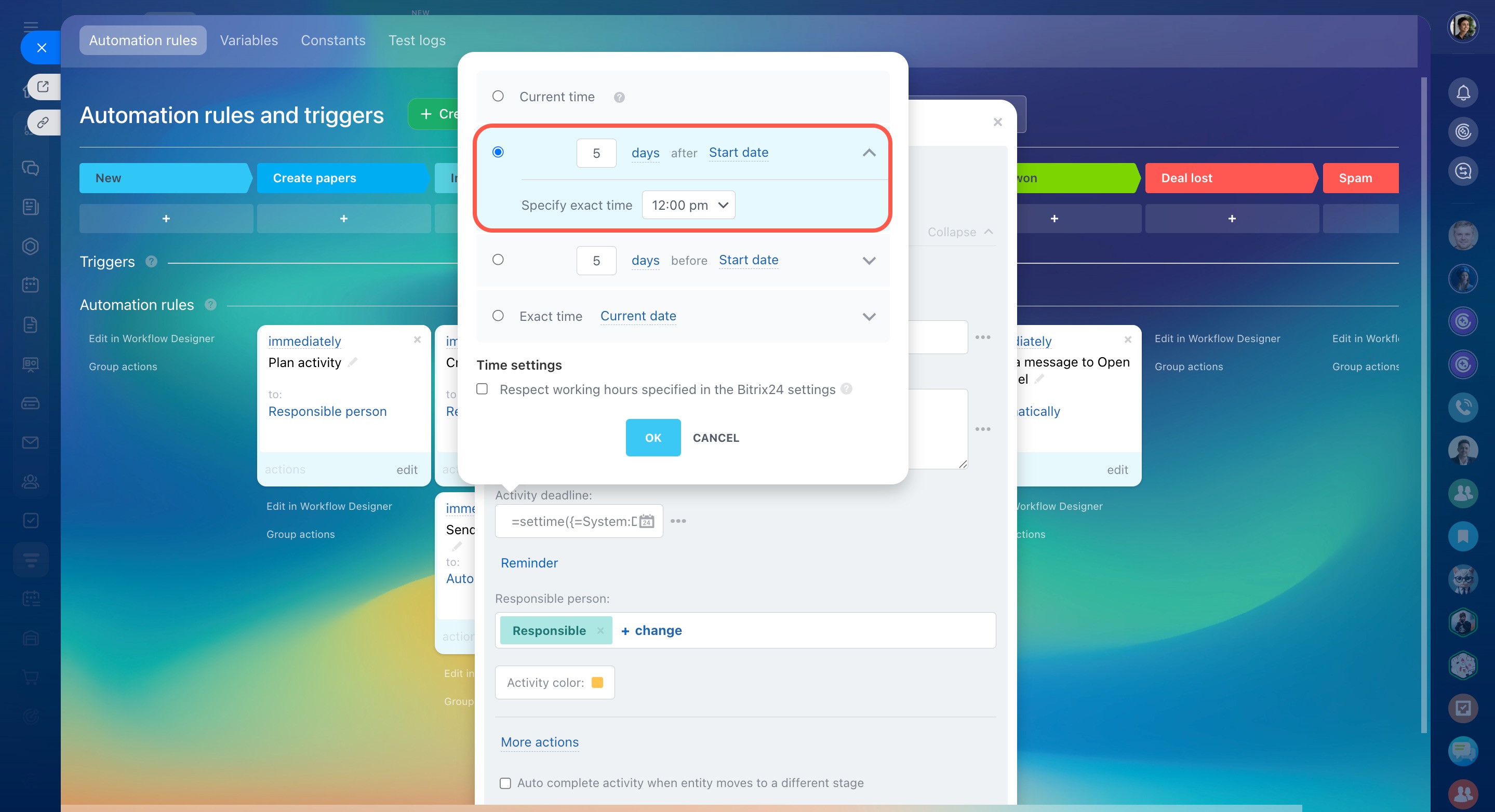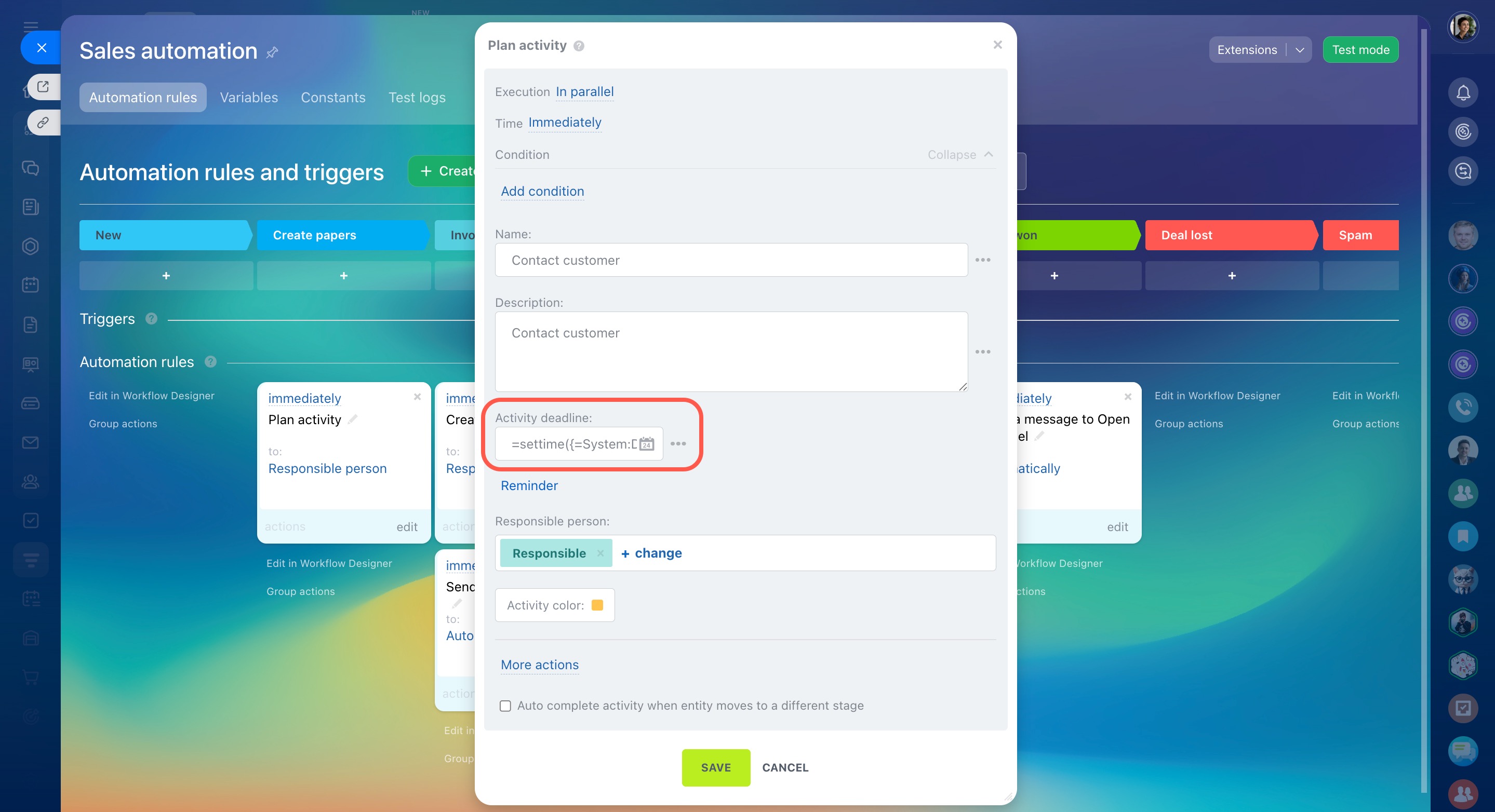 There are automation rules that fill in the fields or change their values. For example, the Create task automation rule fills in the deadline. Now the automation rule can specify not only the date but also the exact time.