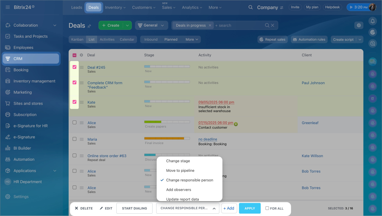 - Group actions in CRM allow you to work with several entities at the same time: convert leads into deals, change the responsible person in several forms or launch an email campaign.