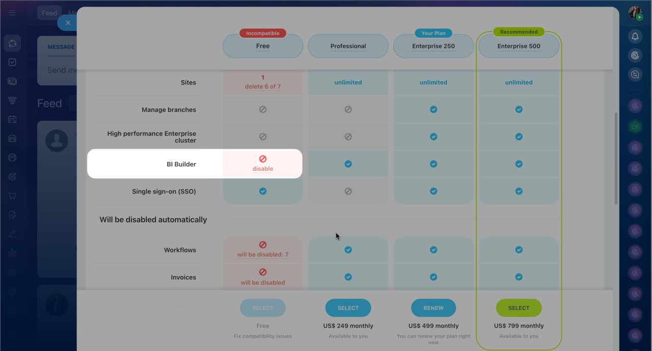 If you switch to the Basic or Free plan, you need to disable BI Builder manually. When switching to the Standard plan, BI Builder stays active, but you can't set permissions to create dashboards.