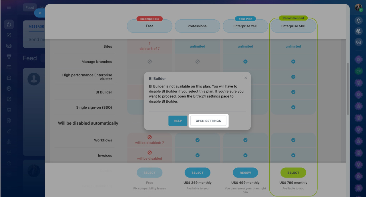 1. In the plan compatibility check, find the BI Builder and click Disable > Open settings.