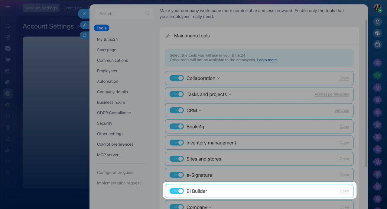 2. Disable BI Builder in the Bitrix24 settings and save the changes.