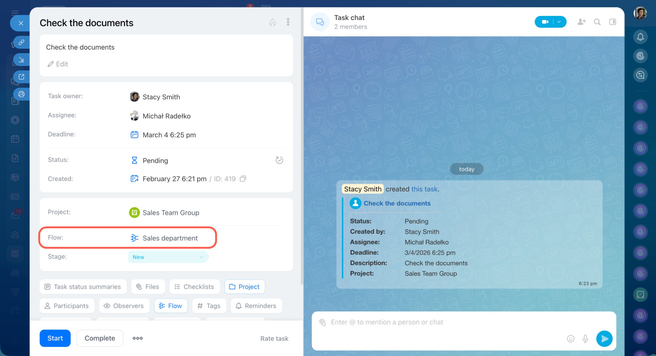You can create a task for a specific department or a workflow, for example, for training new employees. The task will go to the assignee, even if you don't know who should perform the task.