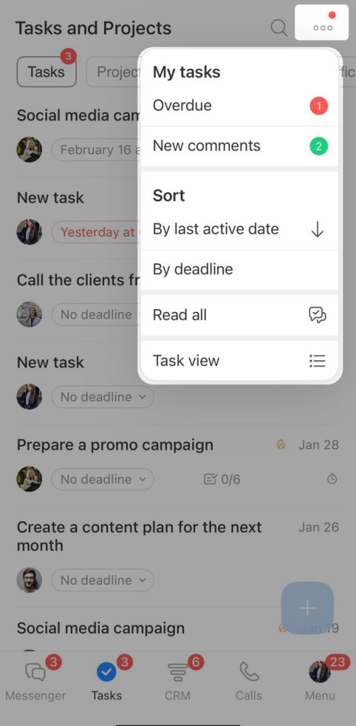 Sort tasks by activity, deadline, or new comments.