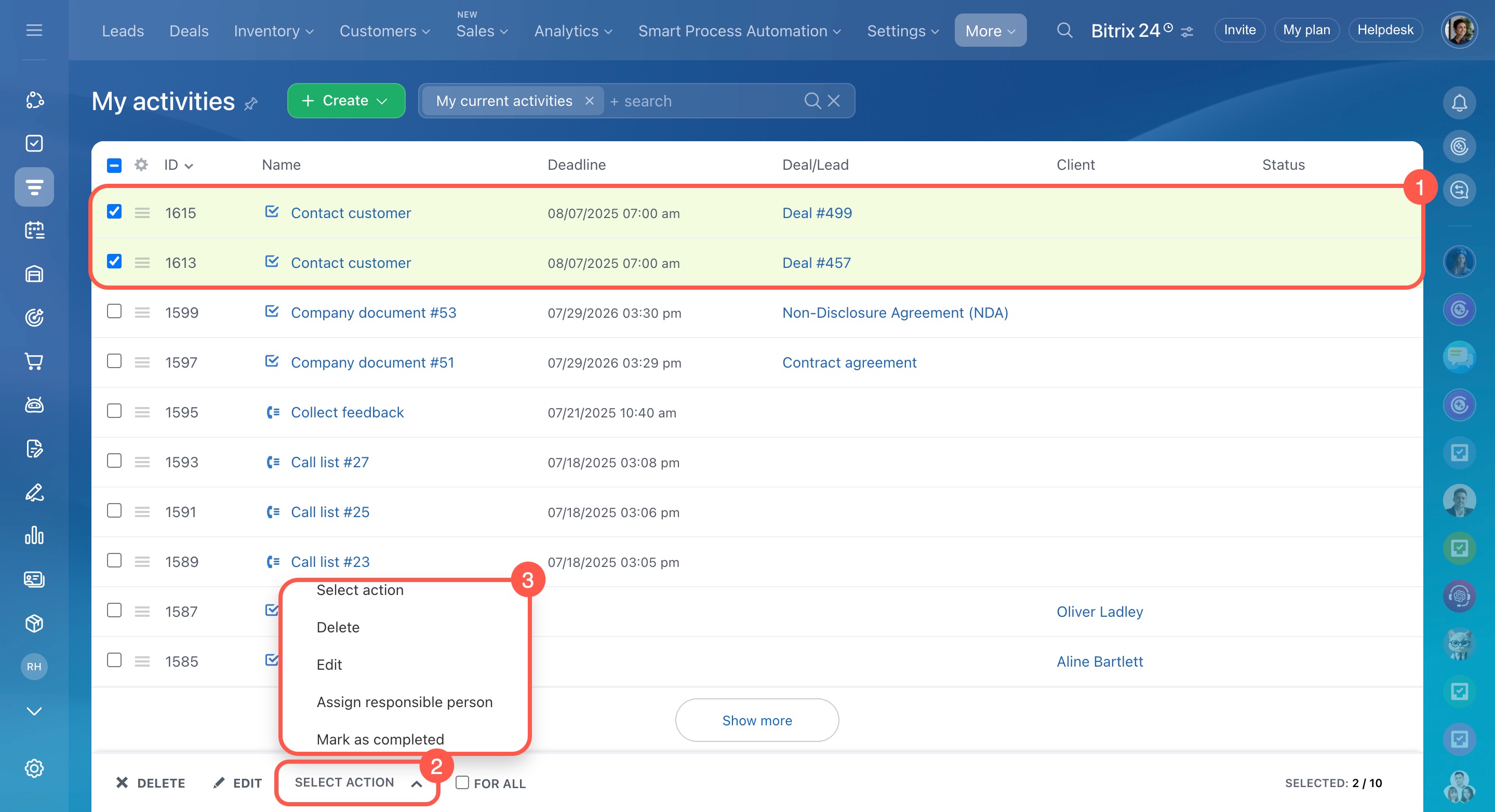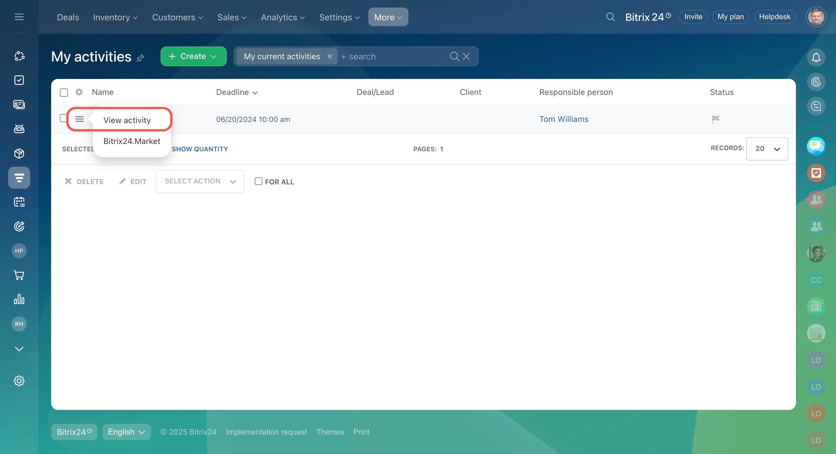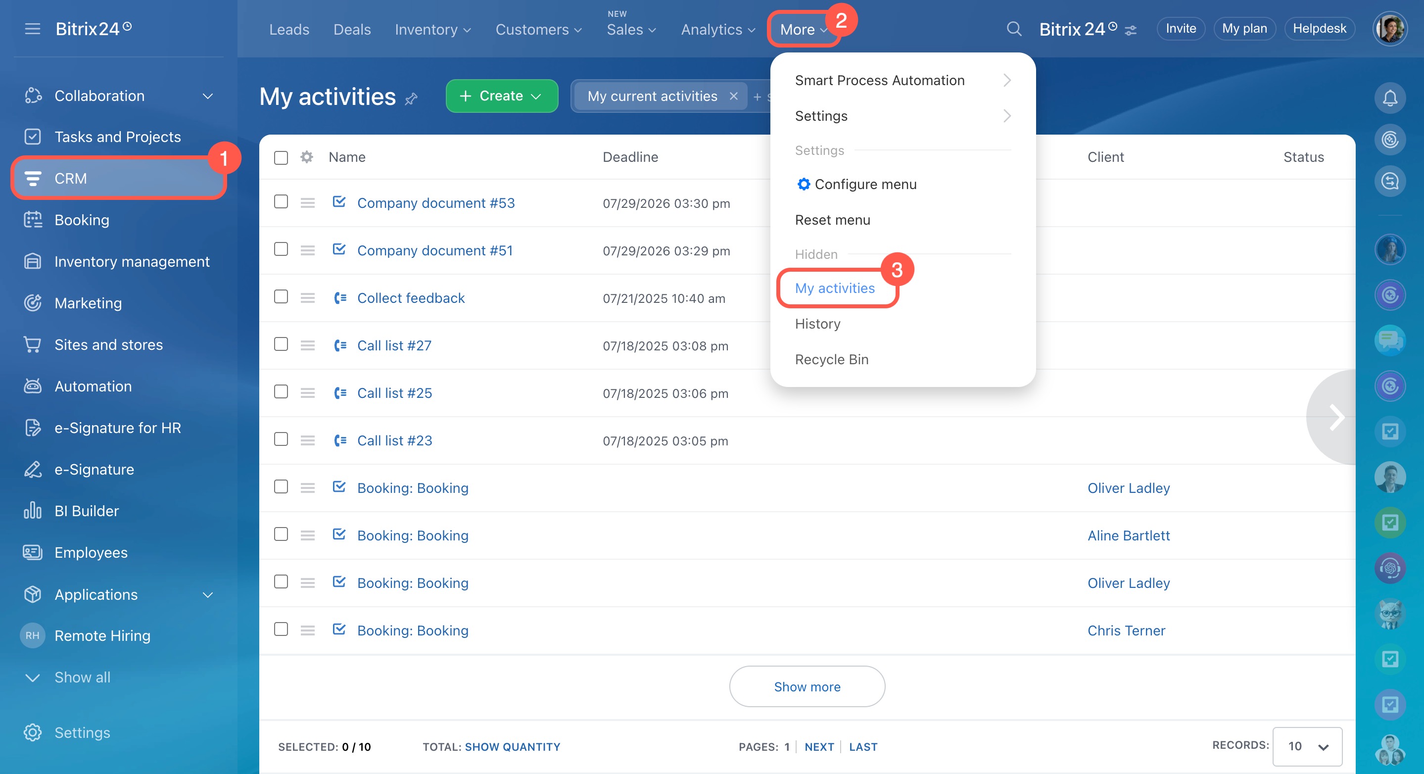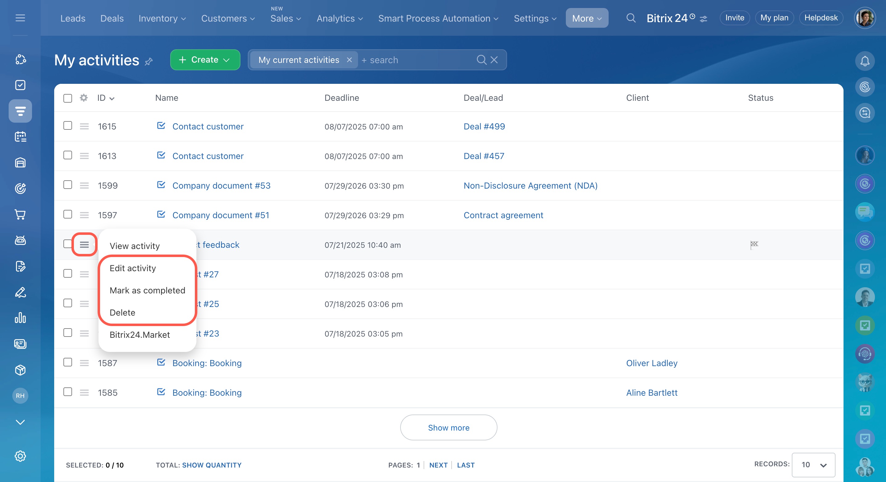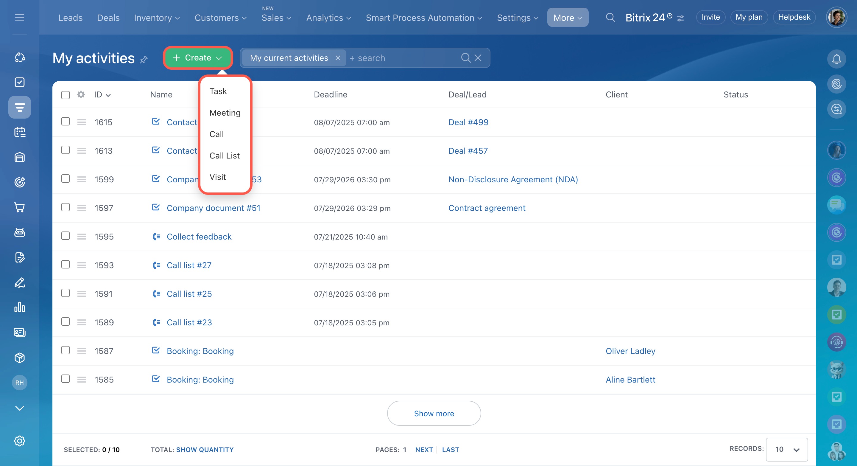 In Bitrix24 CRM, activities are customer-related tasks, such as calls, meetings, or document approval. You can view planned and completed activities under My activities.