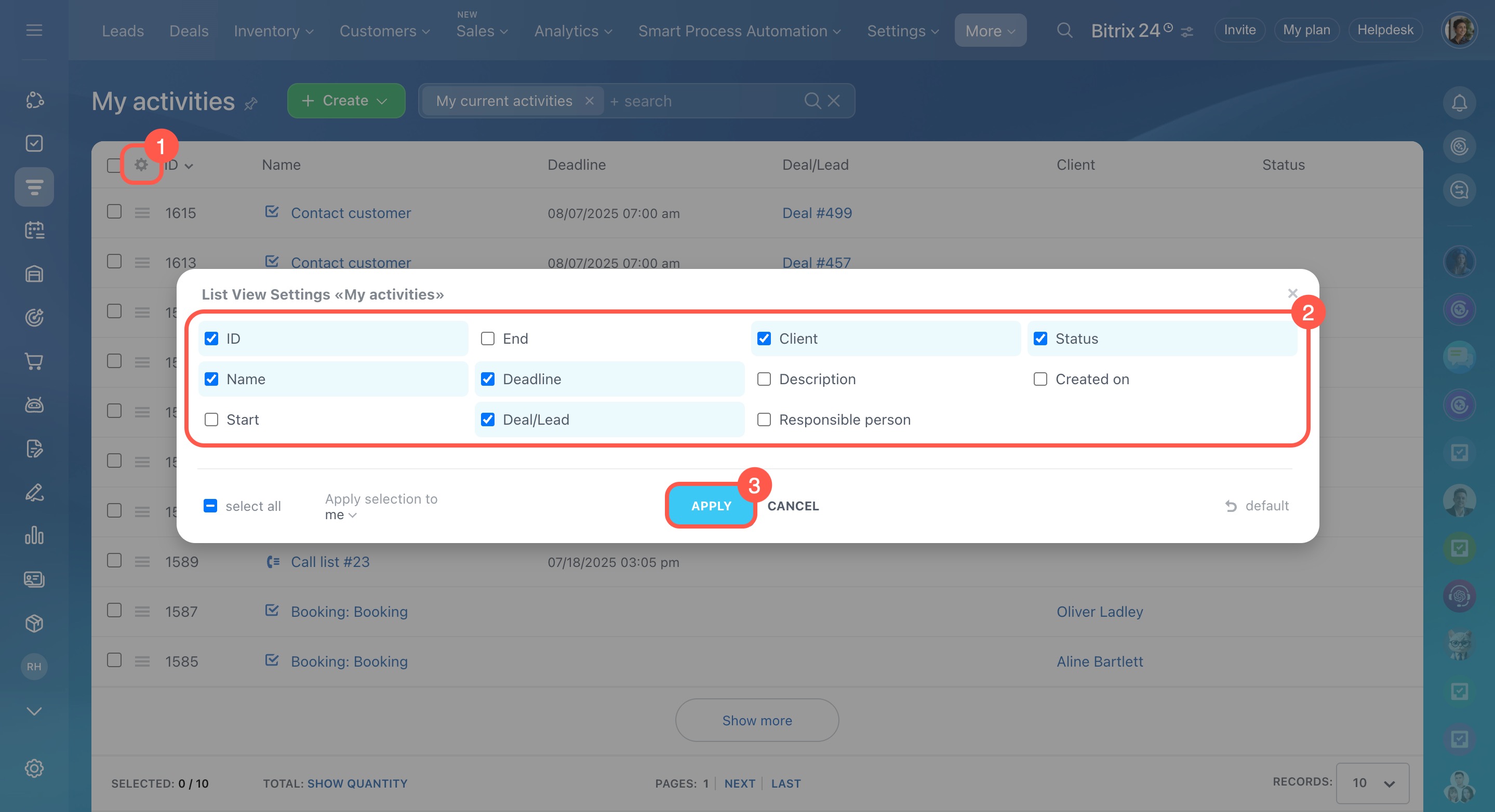 To configure the activity list, click Settings (⚙️), select the needed fields, and click Apply.