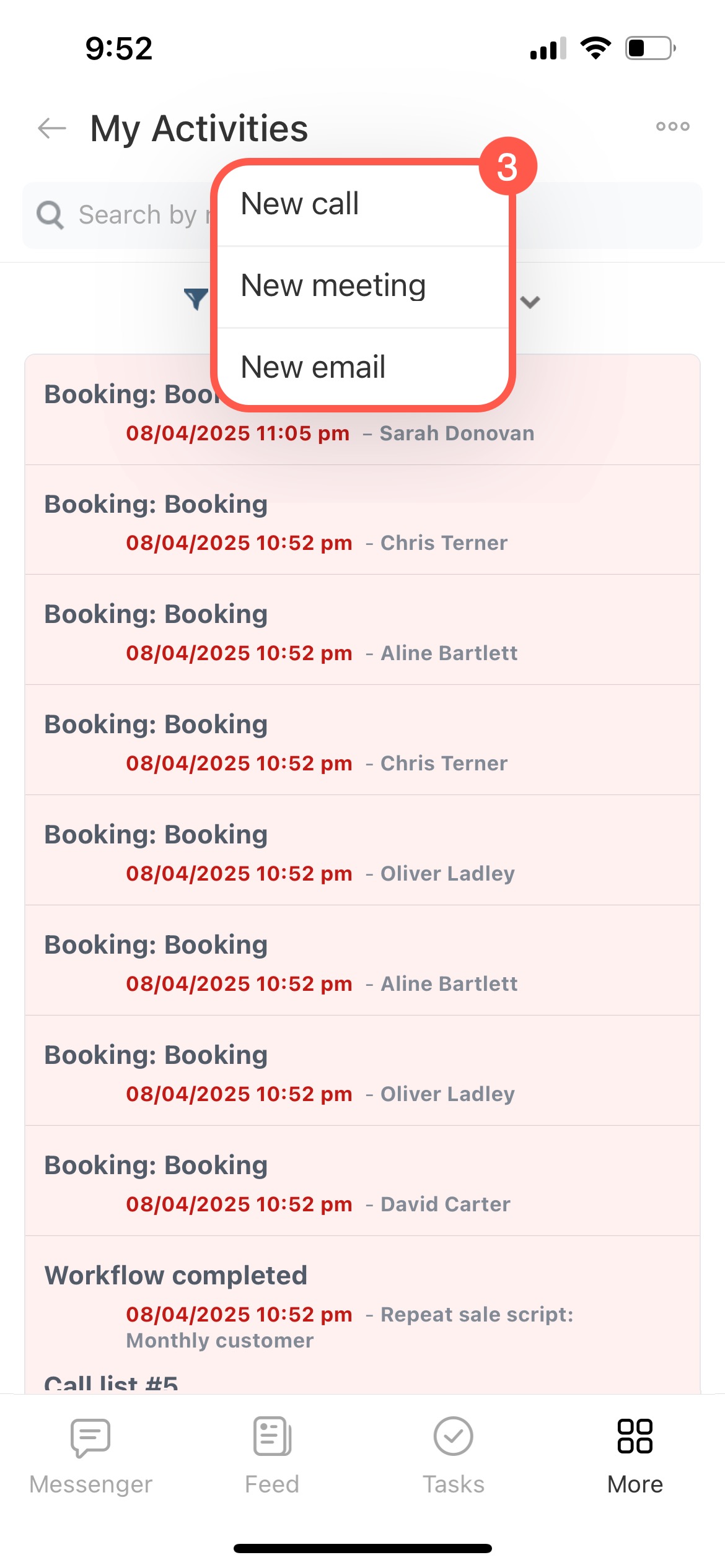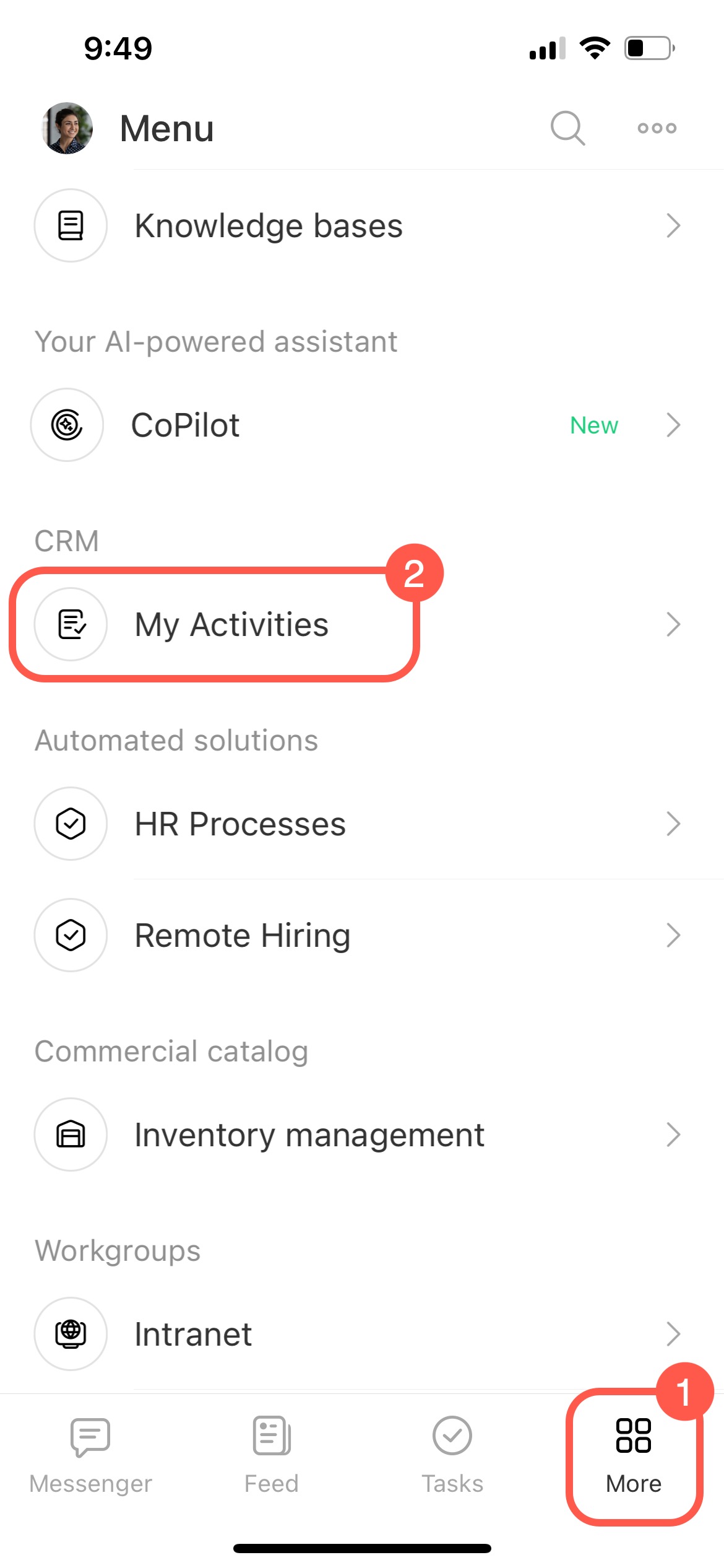 To view planned activities or create new ones, go to CRM > More > My activities.