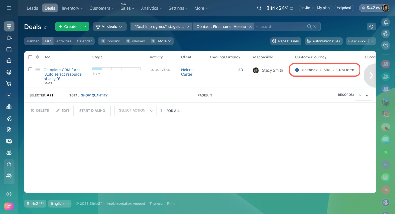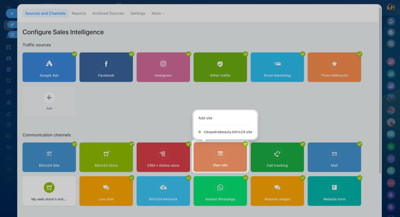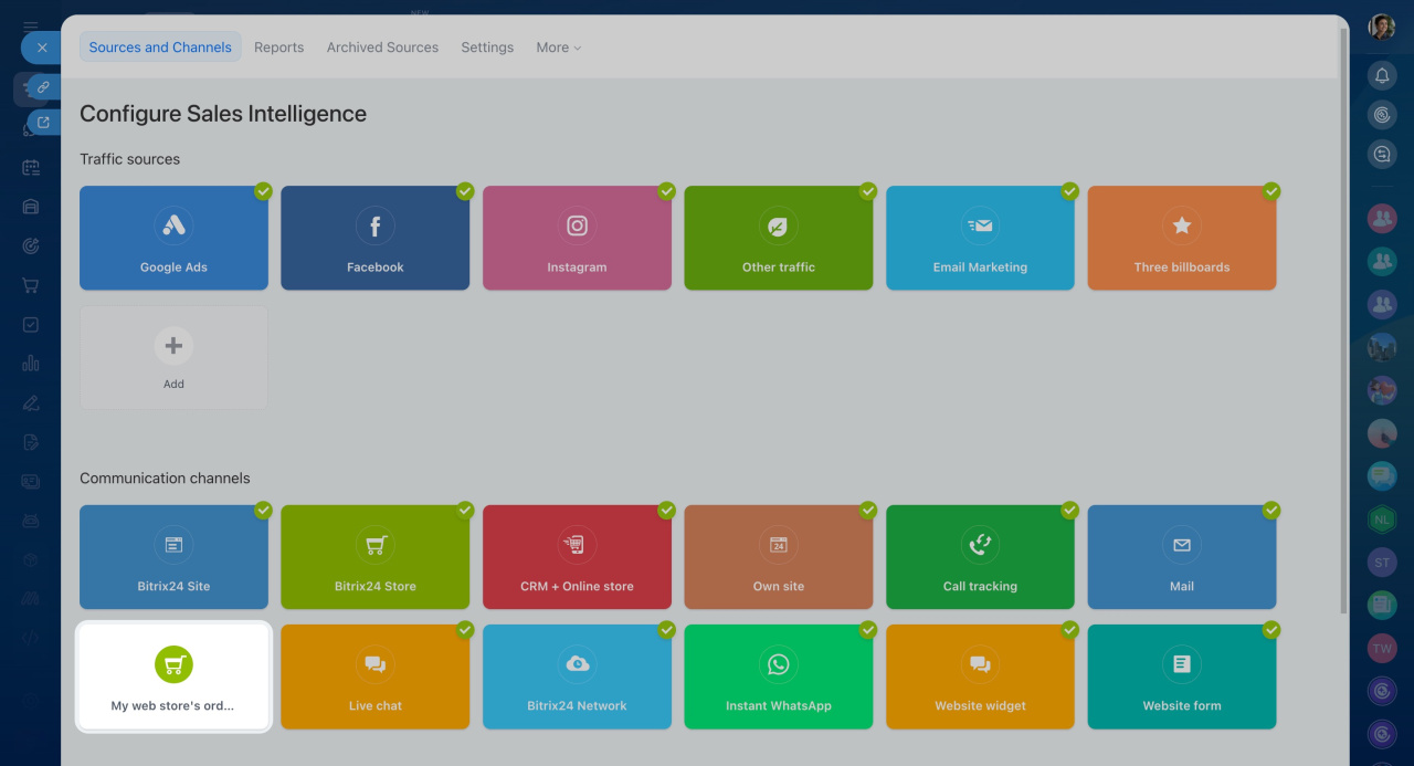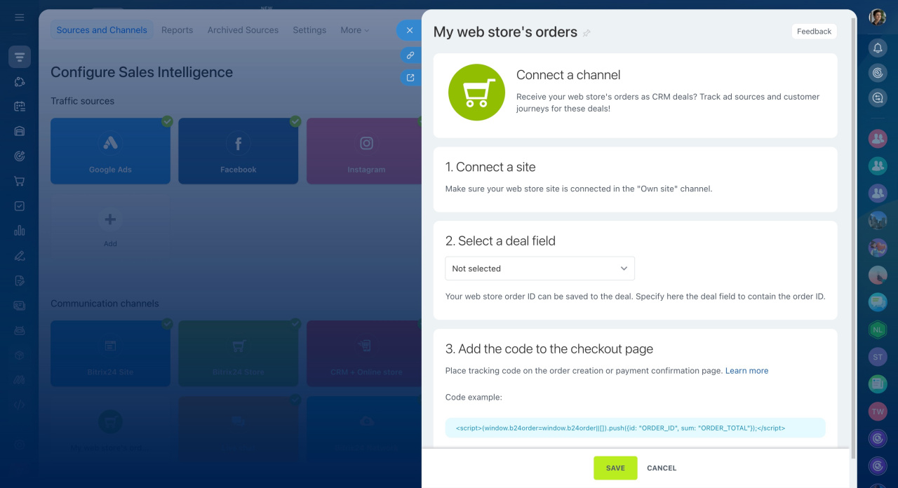 You can connect your online store to Sales Intelligence, even if it was not created in Bitrix24. Once connected, client orders will appear in the Customer journey field and Bitrix24 reports.