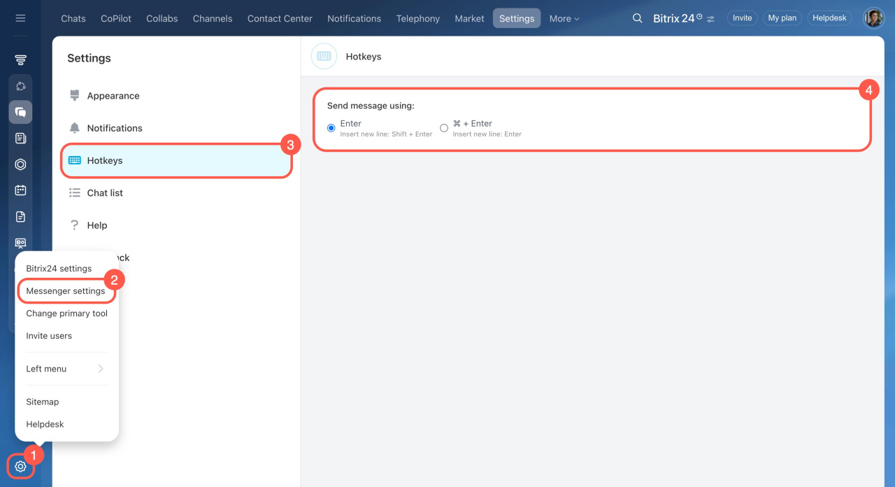 In the web version of Bitrix24, hotkeys are available only for chats and channels. In the Bitrix24 Messenger app, you can use them for chats, calls, and channels. Custom hotkeys cannot be added at the moment.