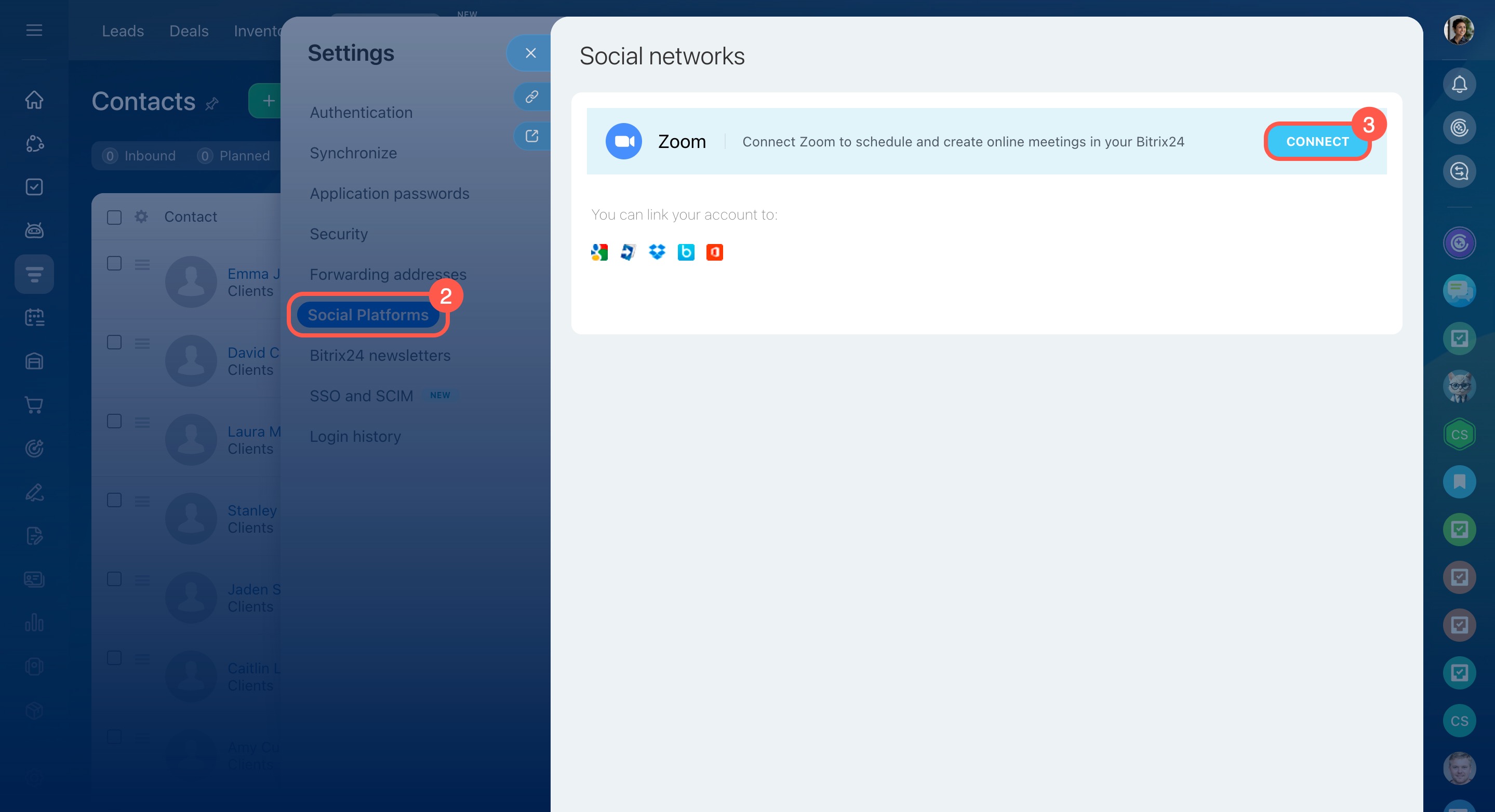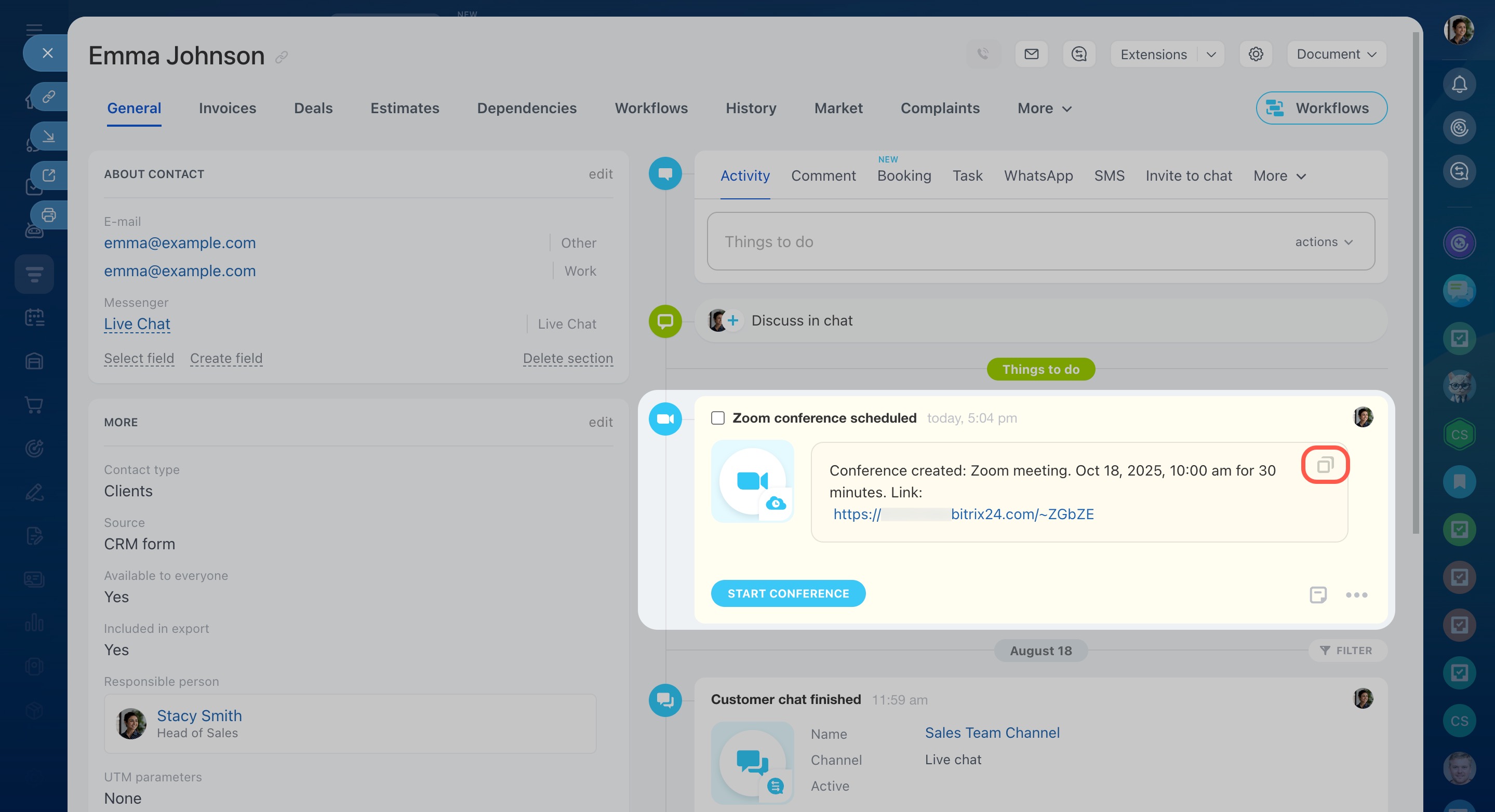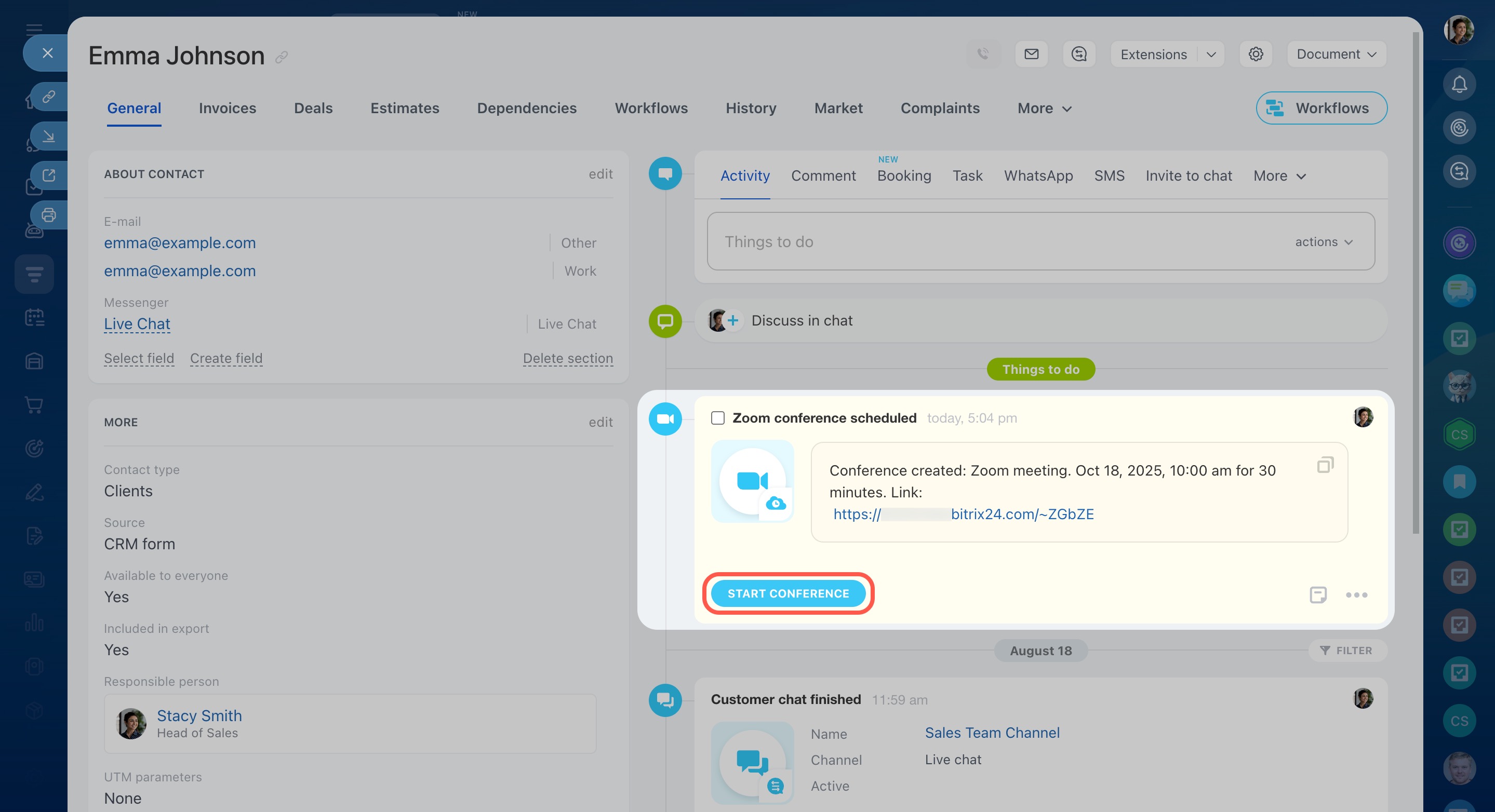 Schedule Zoom meetings and join them directly from the client form in CRM and from the chat. To invite a client, send them a link from Bitrix24 by email, SMS, or WhatsApp.