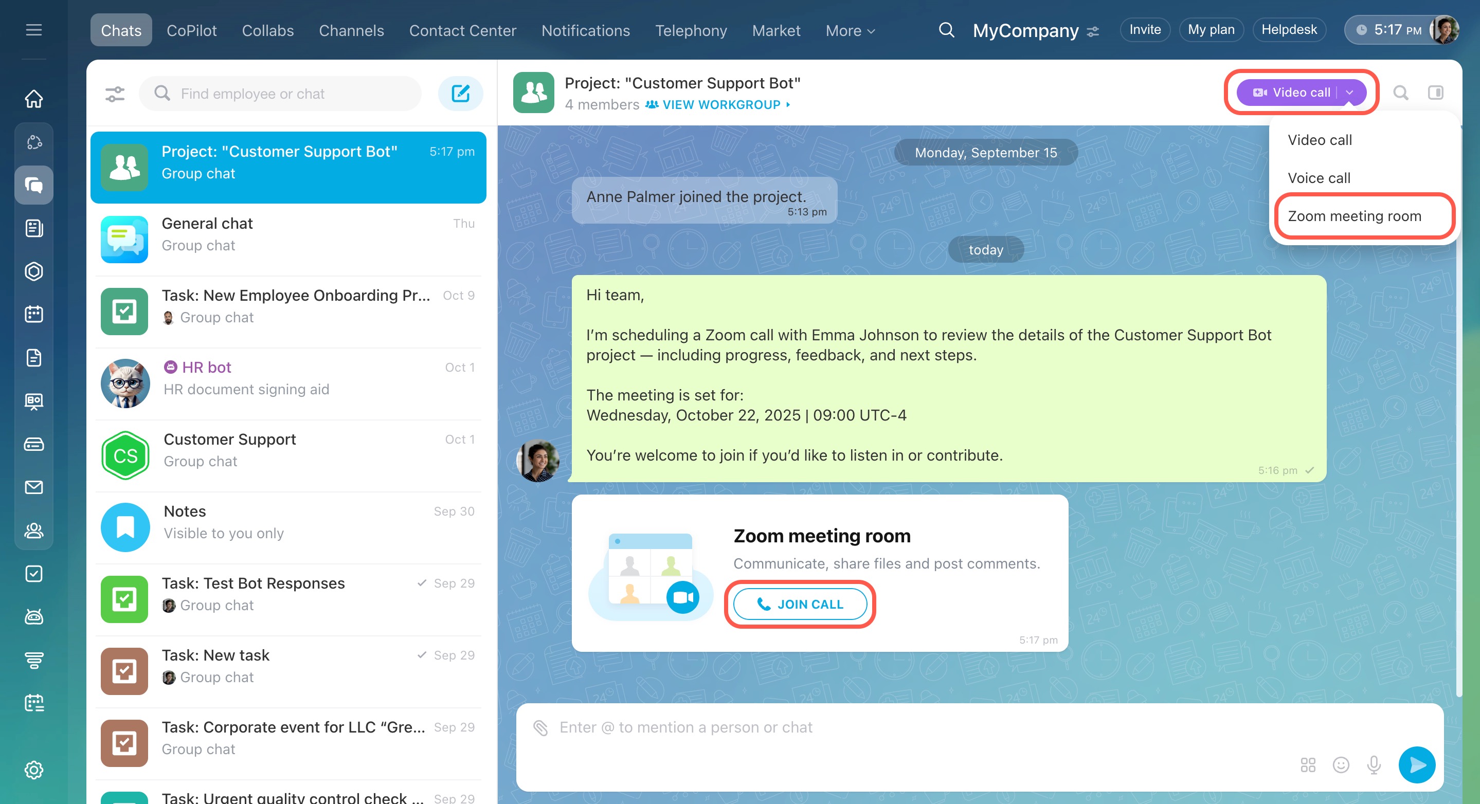 Create a Zoom meeting from a chat to discuss work issues with colleagues. Zoom meetings are available for both direct and group chats. You can't invite external guests.