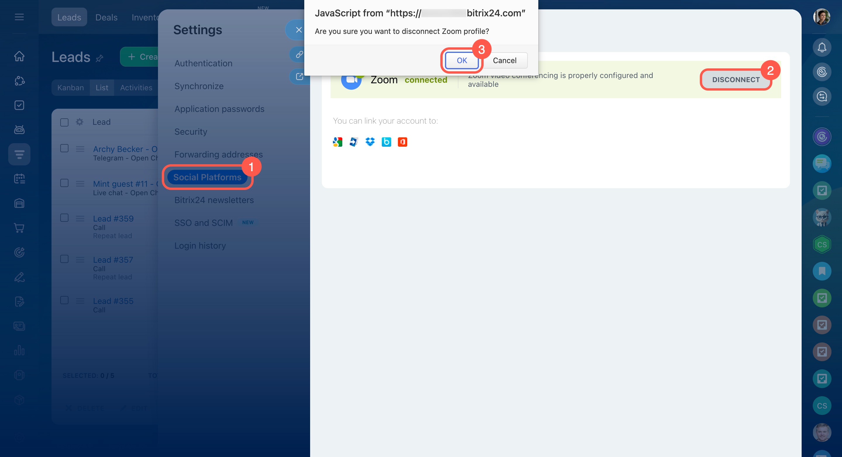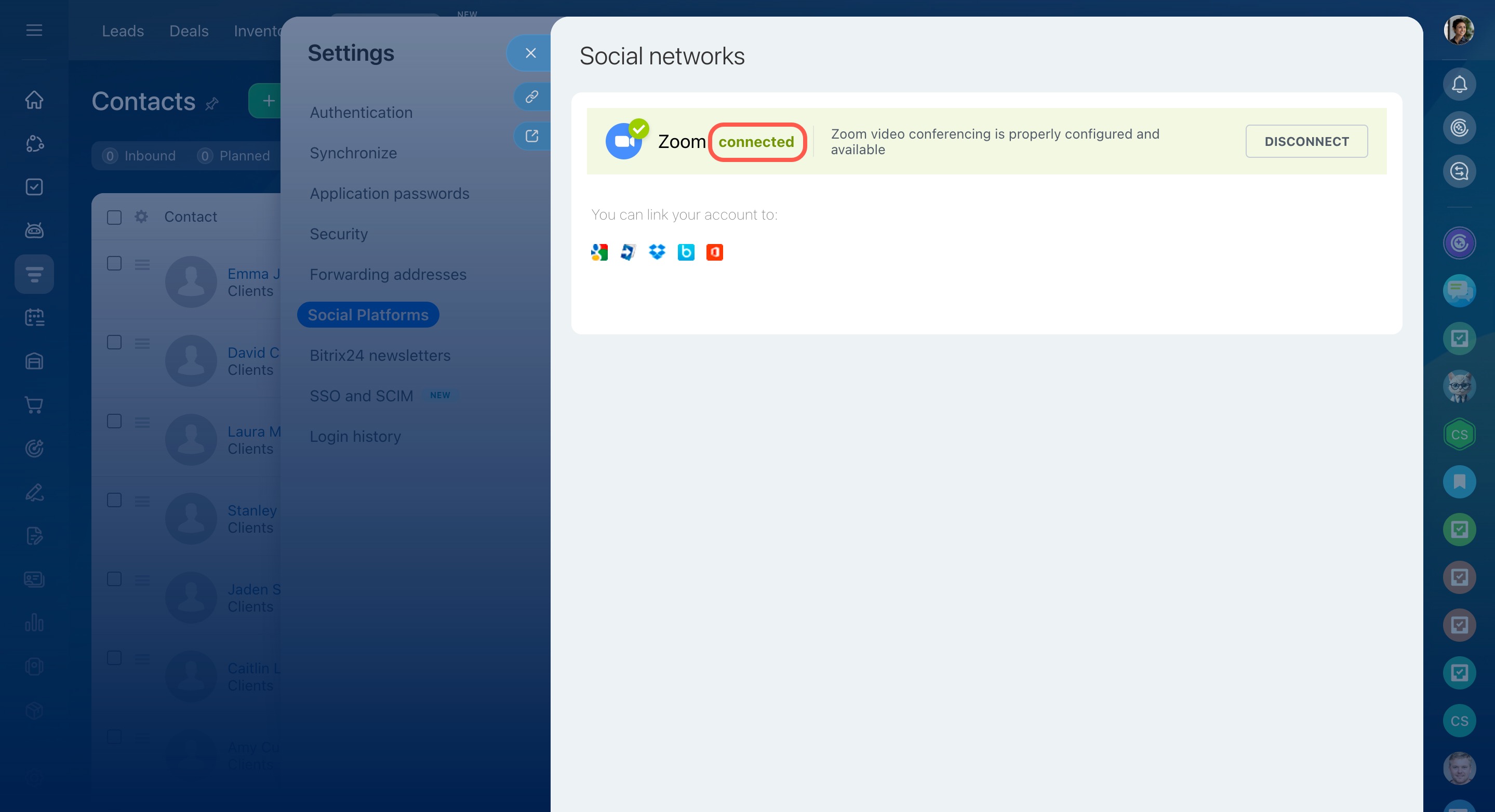 The Zoom account is connected to Bitrix24, and you can create Zoom conferences from CRM or chats.