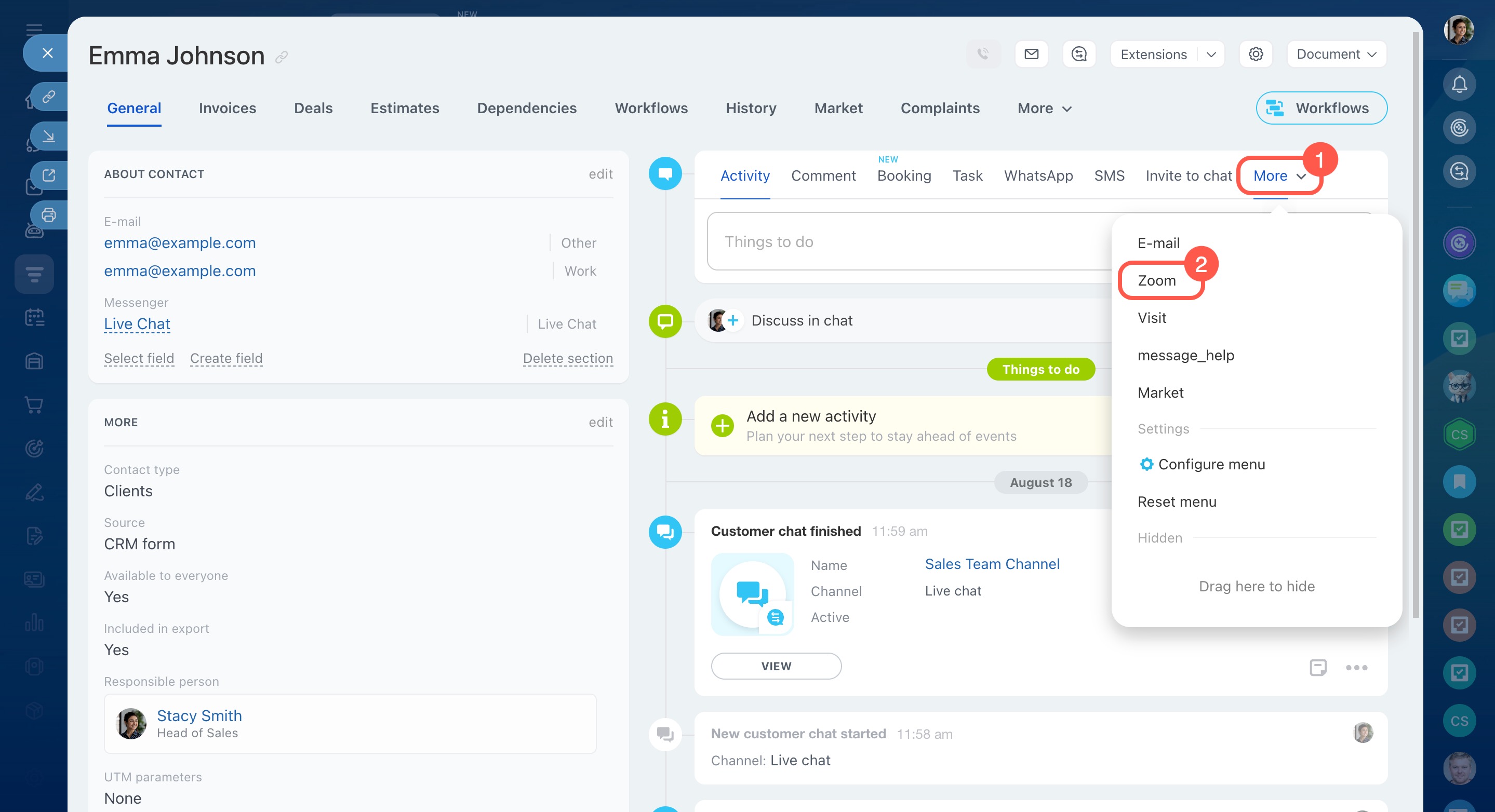 Schedule Zoom meetings and join them directly from the client's form in CRM and from the chat.