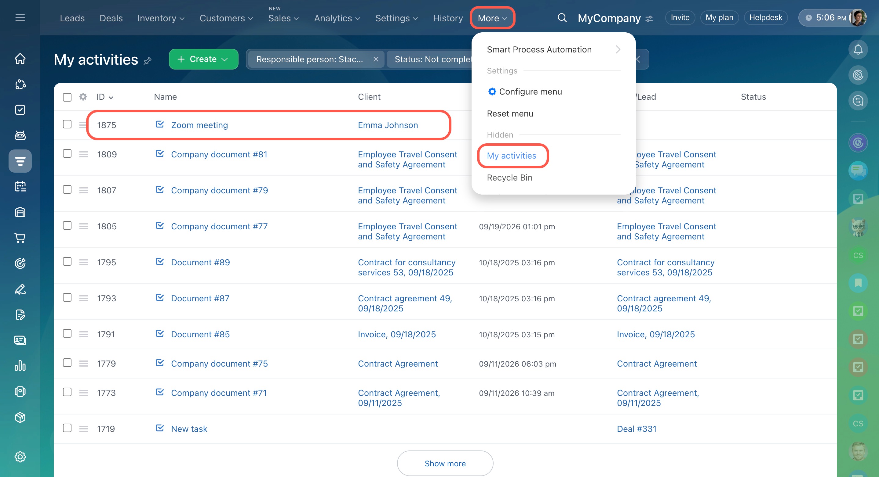 The meeting appears under My activities in CRM. This activity can be viewed by the meeting host and all employees with permissions to access this person's CRM entities.