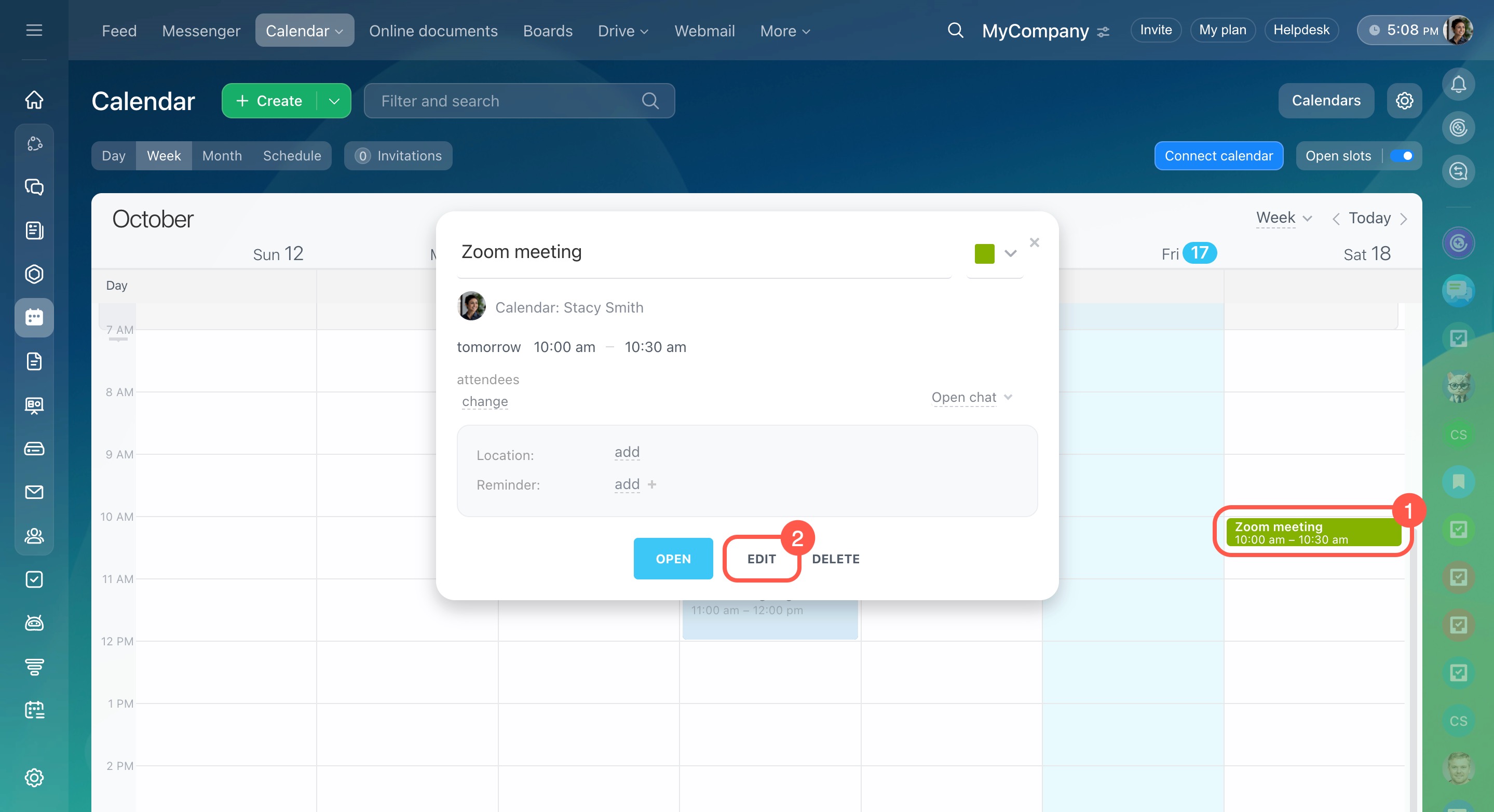 The meeting will also be added to the calendar of the employee who scheduled it. It will have a default name, not the one you specified in CRM. To change it, click on the event block and select Edit in the pop-up window.