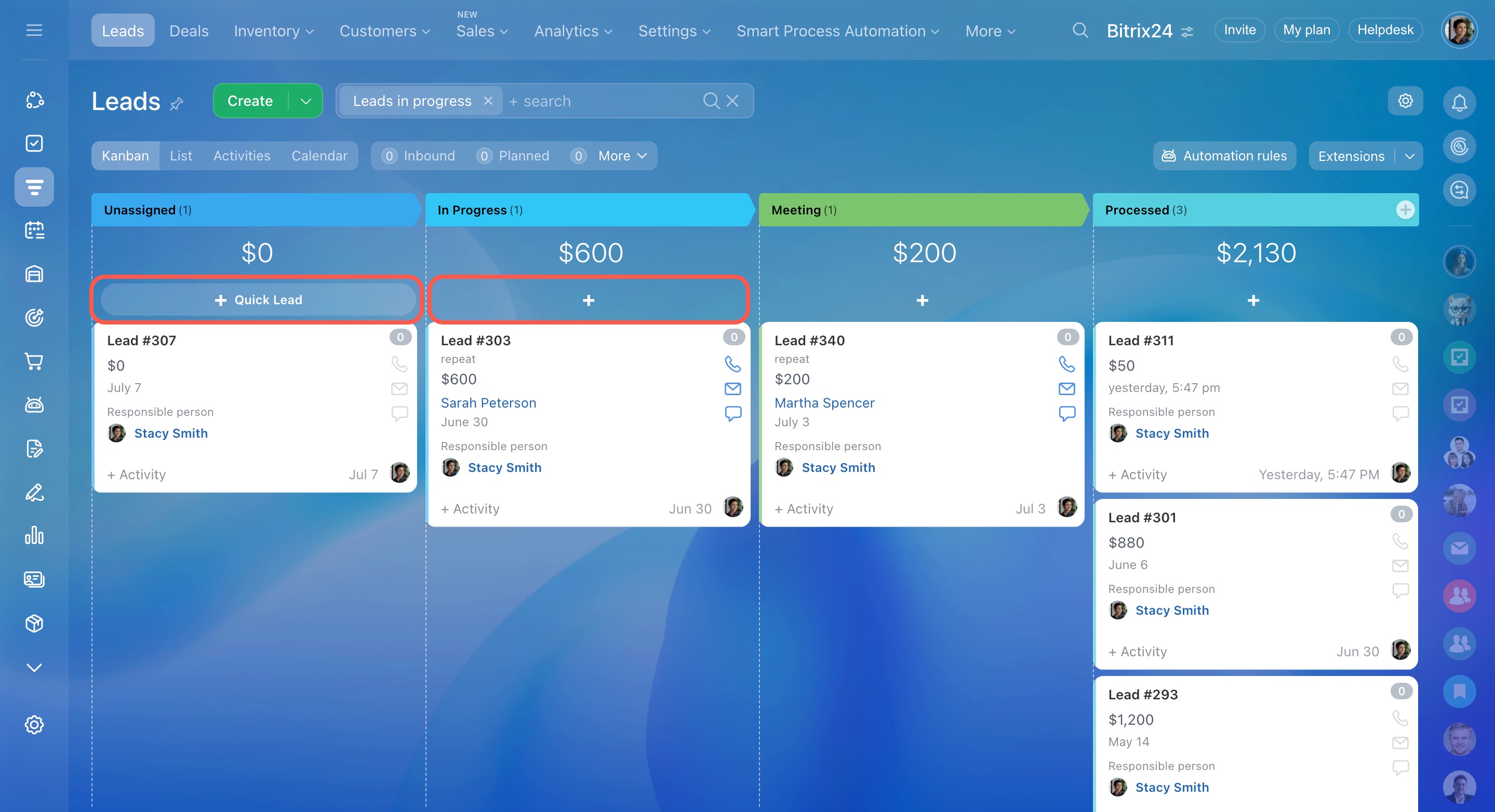 Or, use the Plus (+) button under a column name to create a quick lead.