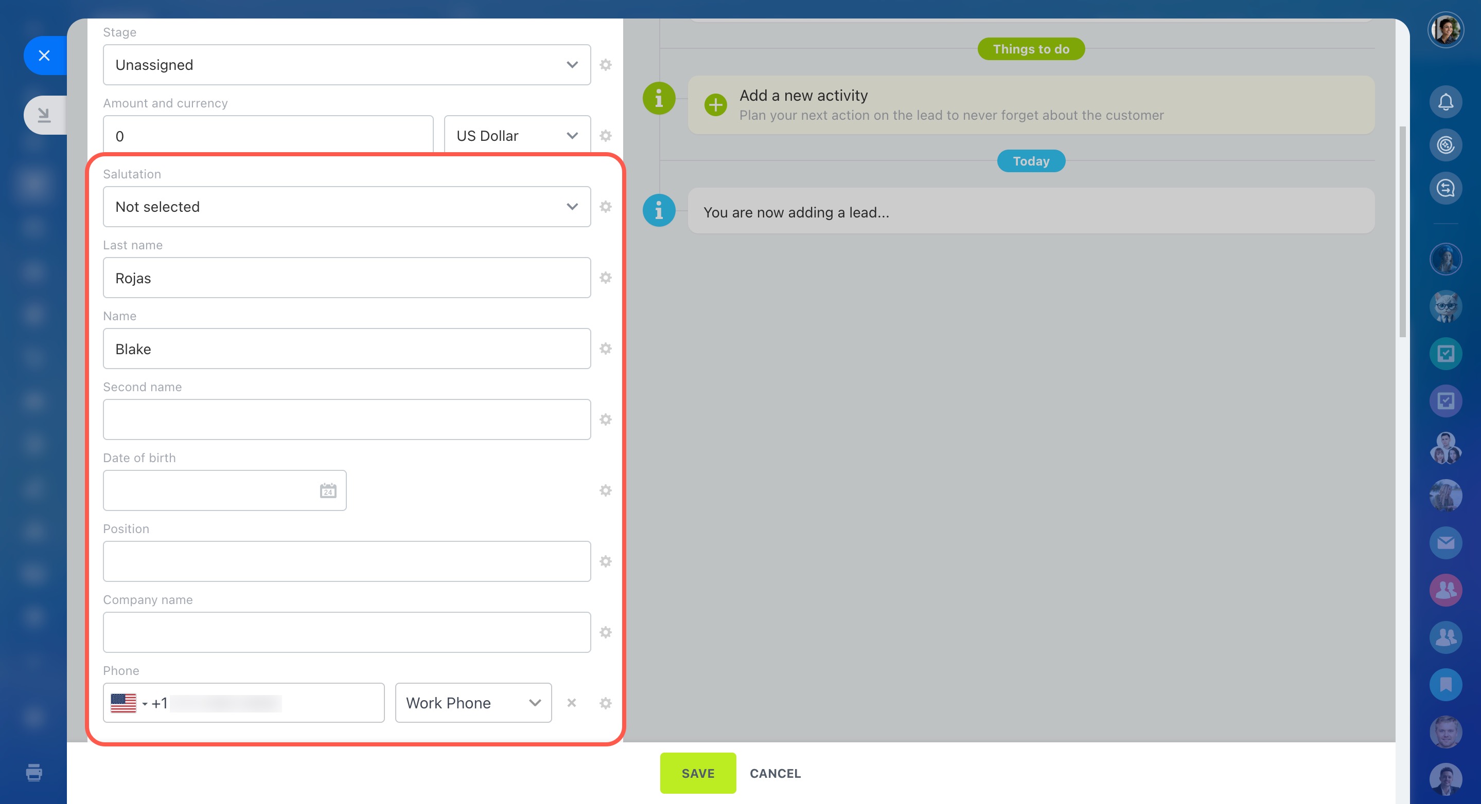 Enter the information in the Last name, Name, and Phone fields. Specify the source, select the responsible person and the observers in the More section.